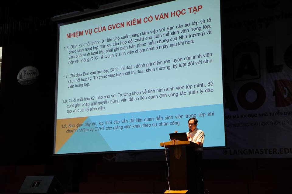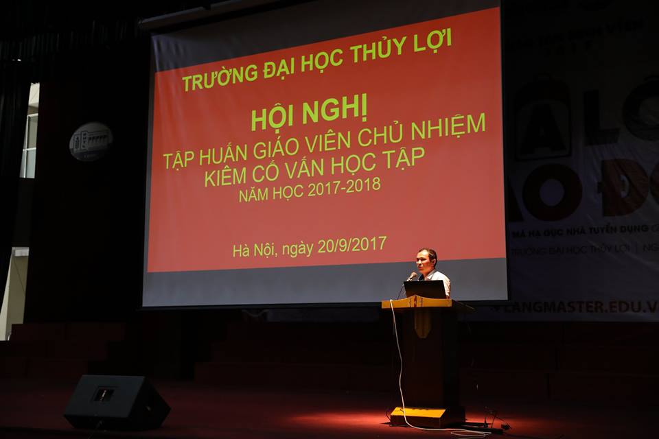 Xuất phát từ tình hình và yêu cầu đó, vào chiều ngày 20/9/2017, Trường Đại học Thủy lợi tổ chức buổi tập huấn giáo viên chủ nhiệm kiêm cố vấn học tập năm học 2017-2018, đồng thời nâng cao kĩ năng công tác quản lý cũng như là để GVCN nắm rõ về quy trình liên quan đến các thủ tục hành chính cho sinh viên.