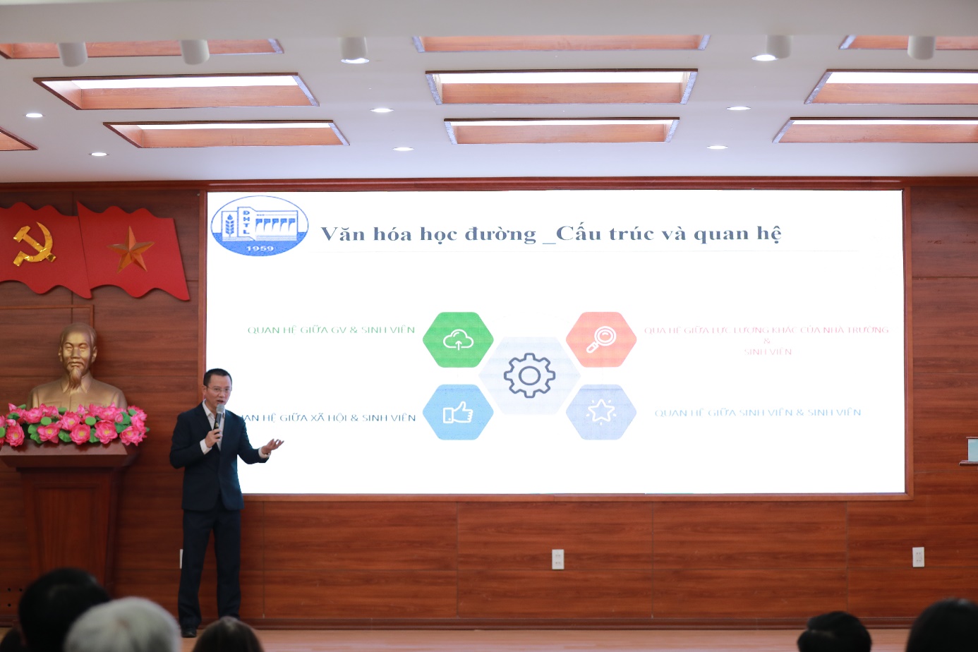 PGS.TS Nguyễn Lương Bằng, Chủ tịch Công đoàn trường đã phân tích tình hình hiện tại của môi trường học đường, đặc biệt là sự thiếu động lực học tập của sinh viên. Tỷ lệ học vụ cao và tỷ lệ tốt nghiệp trung bình vẫn còn lớn, phản ánh sự thiếu kết nối và động lực học tập ở một bộ phận sinh viên. Một trong những nguyên nhân chính là sự đa dạng trong cách ứng xử và phong cách sống của giới trẻ hiện nay, điều này có ảnh hưởng lớn đến văn hóa học đường.
