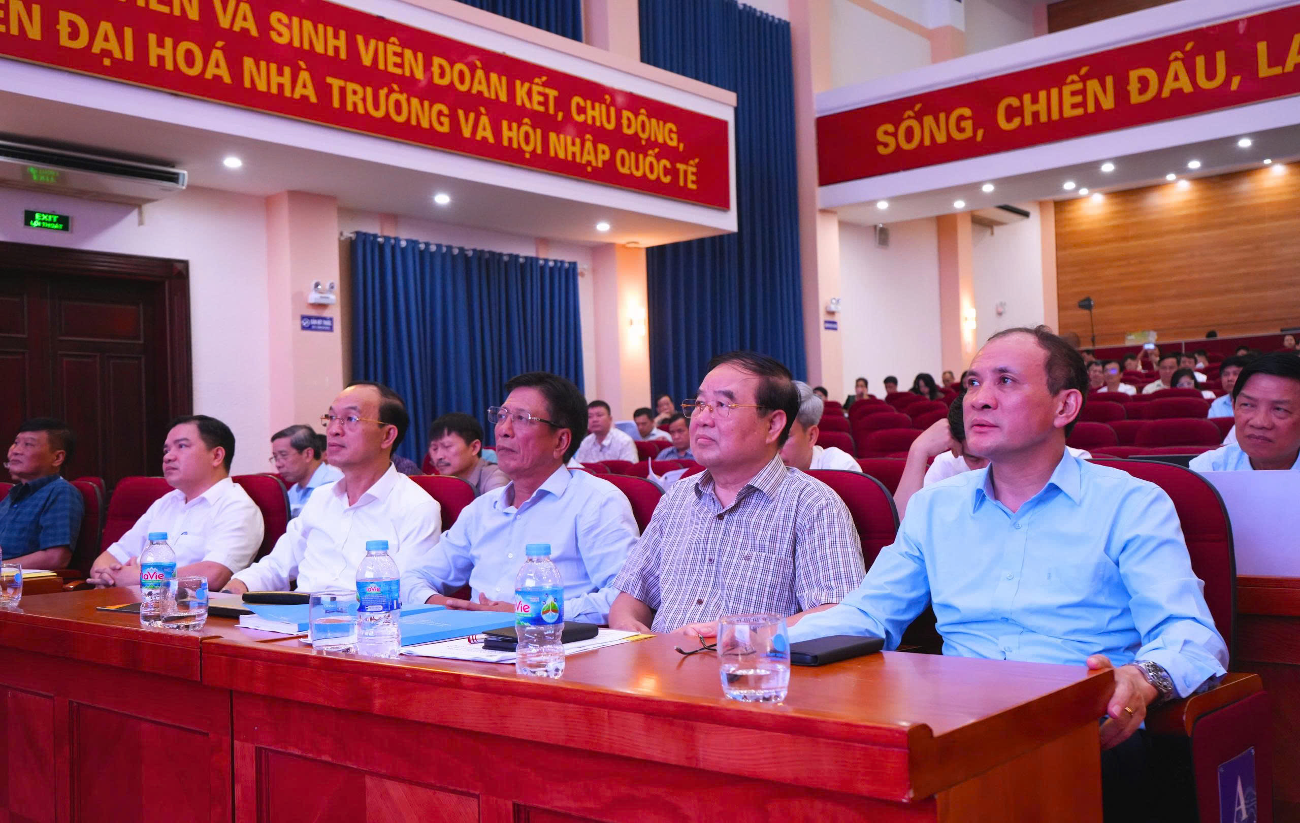 GS.TS Nguyễn Trung Việt – Hiệu trưởng trưởng Đại học Thủy lợi – thành viên Hội đồng Giáo sư cơ sở – ủy viên Hội đồng Giáo sư ngành Thủy lợi (ngoài cùng bên phải), GS.TS Trịnh Minh Thụ – Chủ tịch hội đồng Giáo sư ngành Thủy lợi năm 2025, nguyên Hiệu trưởng trưởng Đại học Thủy lợi (thứ tư từ bên phải sang) dự Hội nghị.