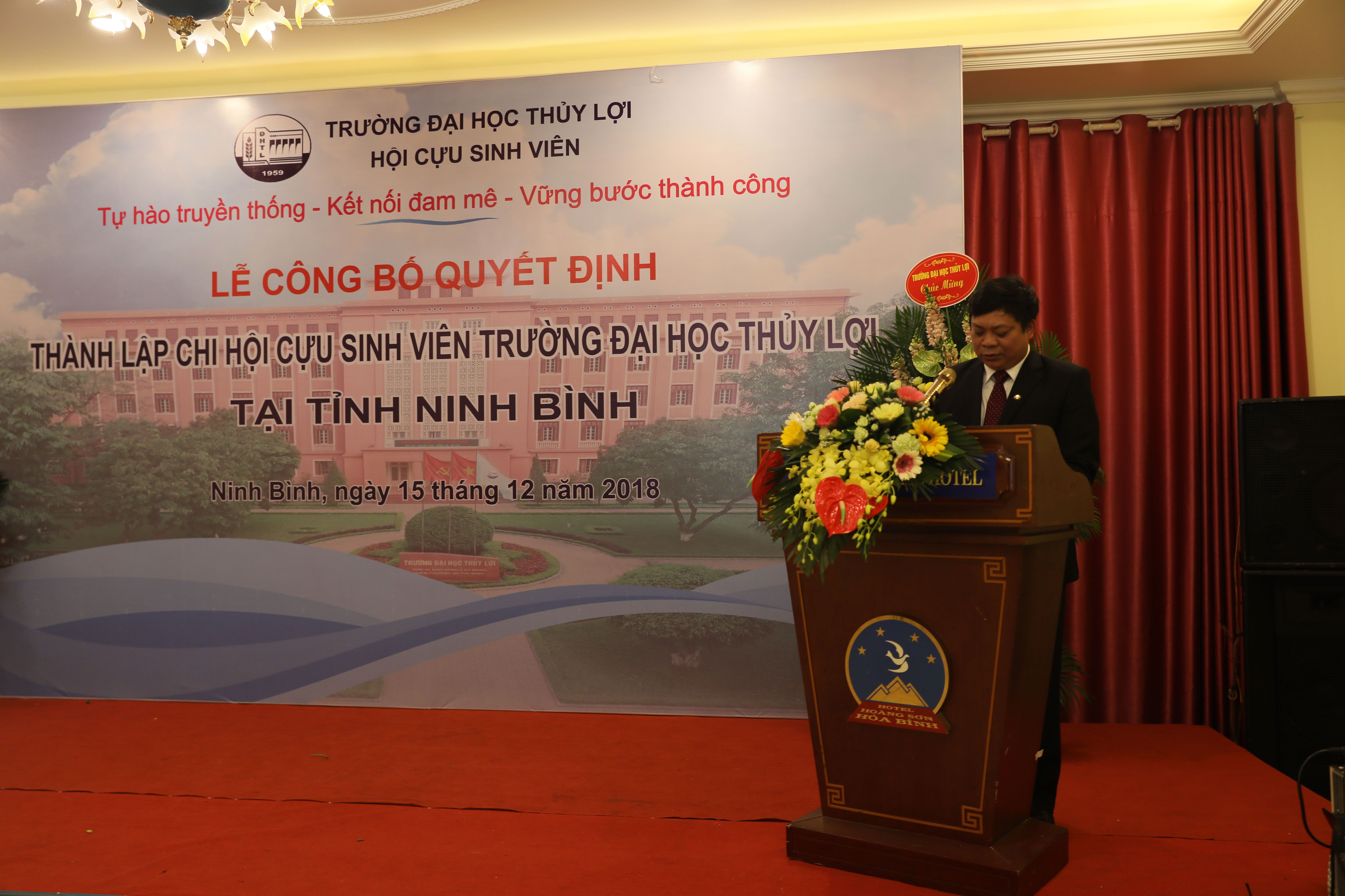 Tại buổi lễ, thay mặt Hội cựu sinh viên Trường Đại học Thủy lợi, Ông Nguyễn Hoàng Hiệp, Phó Bí thư thường trực tỉnh ủy Bắc Kạn và GS. TS Nguyễn Trung Việt – Phó hiệu trưởng Nhà trường đã trao quyết định thành lập chi hội cựu sinh viên Trường Đại học Thủy lợi tại tỉnh Ninh Bình gồm 21 đồng chí. Trong đó có 1 chi hội trưởng là Ông Vũ Nam Tiến – Ủy viên BCH Đảng bộ tỉnh Ninh Bình – Giám đốc Sở NN&PTNT tỉnh – cựu sinh viên K22. 02 chi hội phó là đồng chí Lâm Tuấn (cựu sinh viên K30) – Chi cục trưởng chi cục thủy lợi Ninh Bình và đồng chí Nguyễn Thanh Bình (cựu sinh viên K38) – Trưởng Phòng TCCB – Sở NN&PTNT tỉnh. 01 ủy viên thường trực là đồng chí Đinh Vũ Trường Giang (cựu sinh viên K37) – Trưởng phòng QLXD Công trình – Sở NN&PTNT tỉnh cùng 17 ủy viên hiện đều đang nắm giữ các chức vụ quan trọng tại các Sở, ban, ngành tại địa phương. (danh sách tại đây)