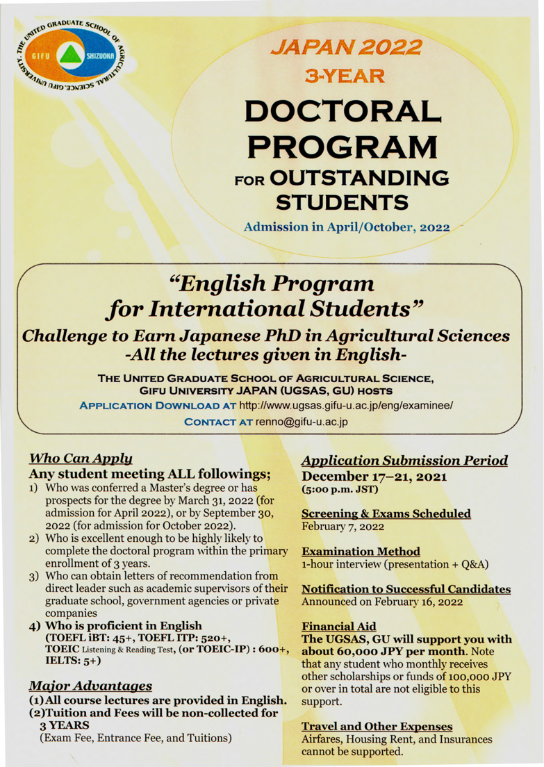 Thông tin chi tiết, vui lòng xem tại website của nhà trường: http://www.ugsas.gifu-u.ac.jp/eng
