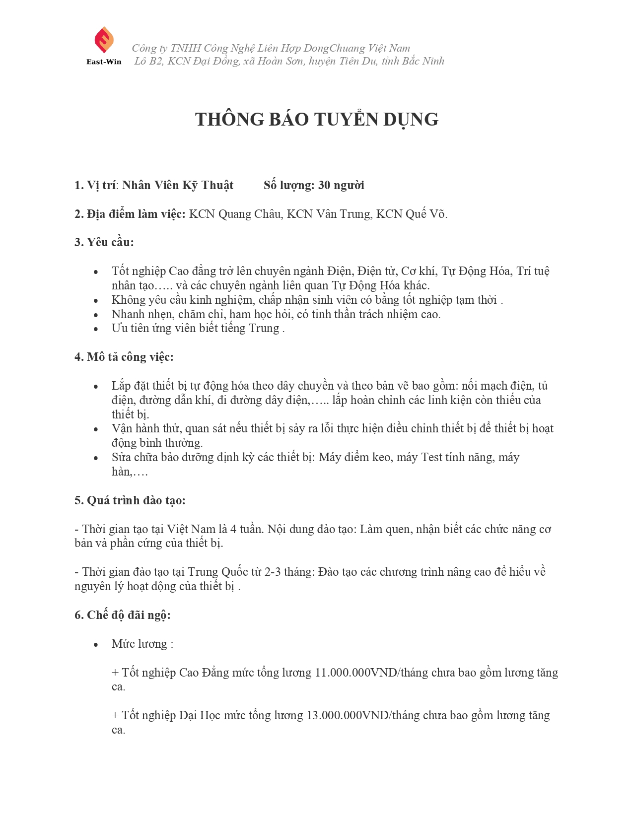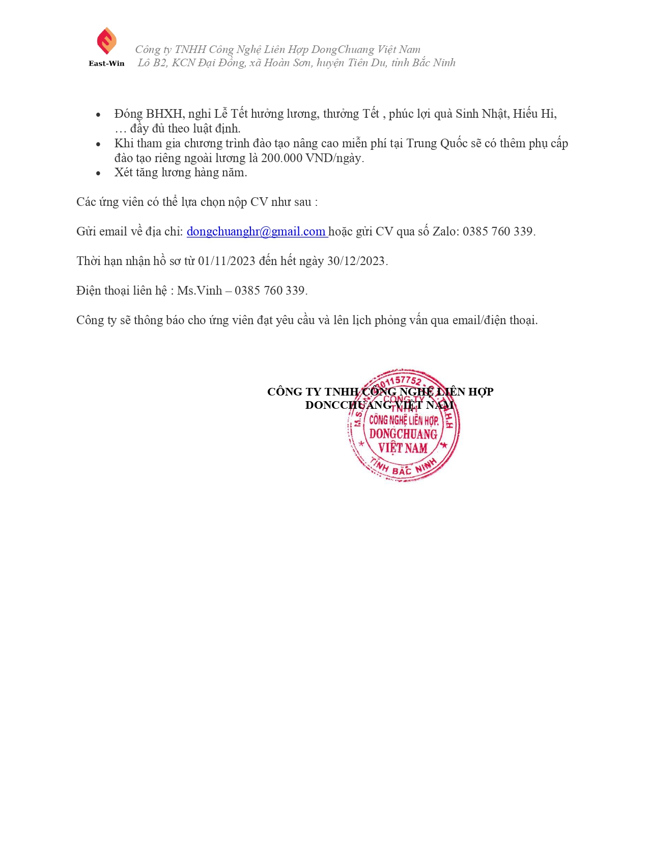 Thông báo tuyển dụng của Công ty TNHH Công nghệ Liên hợp DongChuang Việt Nam Đăng vào 20 Tháng mười một, 2023 bởi Data OldTheo Dõi Trường Đại Học Thủy Lợi Trên Tôi thấy hoa vàng trong sân trường Thủy lợi … 1 năm nữa!Thầy cô – Người xây dựng tương lai cho thế hệ trẻ Bài viết cùng chủ đề: Thông báo tuyển sinh đi học tại Cu-Ba năm 2026 Thông báo kết quả cuộc thi sáng tác Slogan Trường Đại học Thủy lợi Thông báo kết quả Cuộc thi Thiết kế mẫu trang phục tốt nghiệp và đồng phục viên chức Trường Đại học Thủy lợi Thông báo về việc thu học phí học kỳ 1 năm học 2025 – 2026 Thông báo Hưởng ứng Cuộc thi trực tuyến “Tìm hiểu Luật Phòng, chống tác hại của thuốc lá” Kế hoạch xét chọn sinh viên nhận học bổng Hessen, CHLB Đức năm học 2025-2026 Công ty Cổ phần tư vấn xây dựng công trình giao thông 2 tuyển dụng Quyết định ban hành Quy định về thi Olympic các môn học của Trường Đại học Thủy lợi
