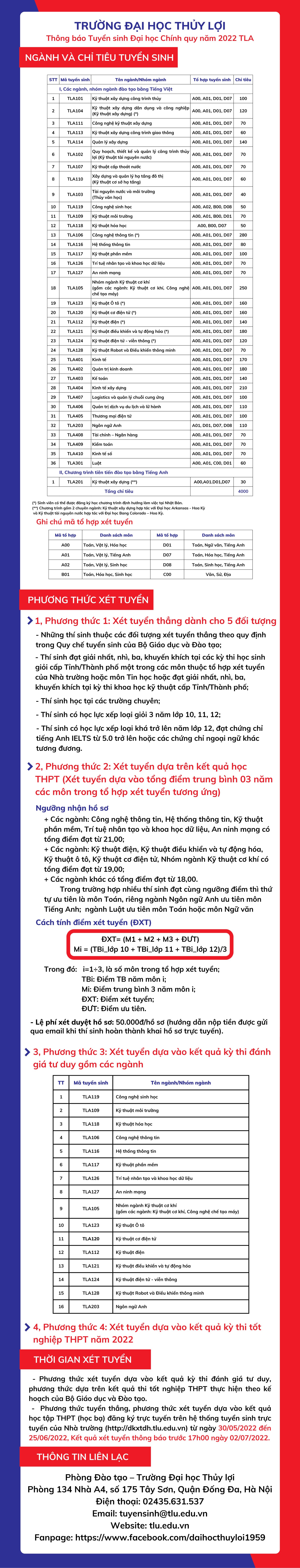 Thông báo tuyển sinh đại học chính quy năm 2022 Đăng vào 27 Tháng 5, 2022 bởi Data OldTheo Dõi Trường Đại Học Thủy Lợi Trên Trường Đại học Thủy lợi trân trọng thông báo./.Xem chi tiết thông báo tại ĐÂYXem hướng dẫn đăng ký xét tuyển tại Đây Nam sinh Phân hiệu trường Đại học Thủy lợi ‘gây sốt’ với nụ cười tỏa nắngLễ trao giải Kỳ thi Olympic Toán học sinh viên – học sinh toàn quốc năm 2022 Bài viết cùng chủ đề: 80 năm ngành Thủy lợi Việt Nam: Trụ cột phát triển bền vững Đại hội đại biểu Đảng bộ phường Kim Liên: “Đoàn kết – Kỷ cương – Sáng tạo – Phát triển” Trường Đại học Thủy lợi vào viếng Lăng Bác, Báo công dâng Bác và Lễ kết nạp đảng viên mới chào mừng các sự kiện trọng đại Danh sách công bố quốc tế năm 2024 GS.TS Nguyễn Trung Việt trúng cử Ban Chấp hành Đảng bộ các trường ĐH, CĐ Hà Nội Đảng bộ Trường Đại học Thủy lợi chuẩn bị chu đáo cho Lễ kết nạp Đảng viên mới Dự án Trung tâm Xuất sắc ACROSS về “Nghiên cứu tính toán nâng cao cho Khoa học bền vững” Những bàn tay nối dài từ một gia đình