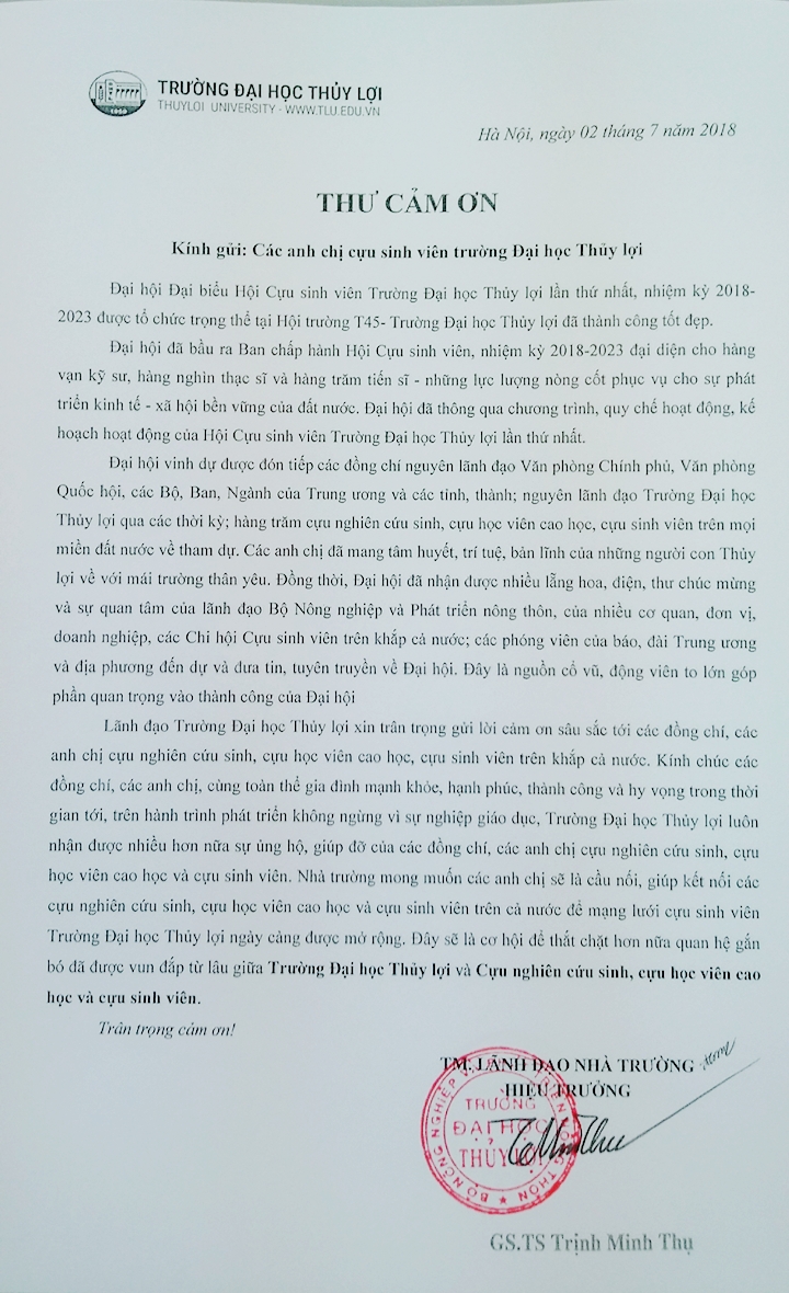 Lãnh đạo Trường Đại học Thủy lợi xin trân trọng gửi lời cảm ơn sâu sắc tới các đồng chí, các anh chị cựu nghiên cứu sinh, cựu học viên cao học, cựu sinh viên trên khắp cả nước. Kính chúc các đồng chí, các anh chị, cùng toàn thể gia đình mạnh khỏe, hạnh phúc, thành công và hy vọng trong thời gian tới, trên hành trình phát triển không ngừng vì sự nghiệp giáo dục, Trường Đại học Thủy lợi luôn nhận được nhiều hơn nữa sự ủng hộ, giúp đỡ của các đồng chí, các anh chị cựu nghiên cứu sinh, cựu học viên cao học và cựu sinh viên. Nhà trường mong muốn các anh chị sẽ là cầu nối, giúp kết nối các cựu nghiên cứu sinh, cựu học viên cao học và cựu sinh viên trên cả nước để mạng lưới cựu sinh viên Trường Đại học Thủy lợi ngày càng được mở rộng. Đây sẽ là cơ hội để thắt chặt hơn nữa quan hệ gắn bó đã được vun đắp từ lâu giữa Trường Đại học Thủy lợi Cựu nghiên cứu sinh, cựu học viên cao học và cựu sinh viên.