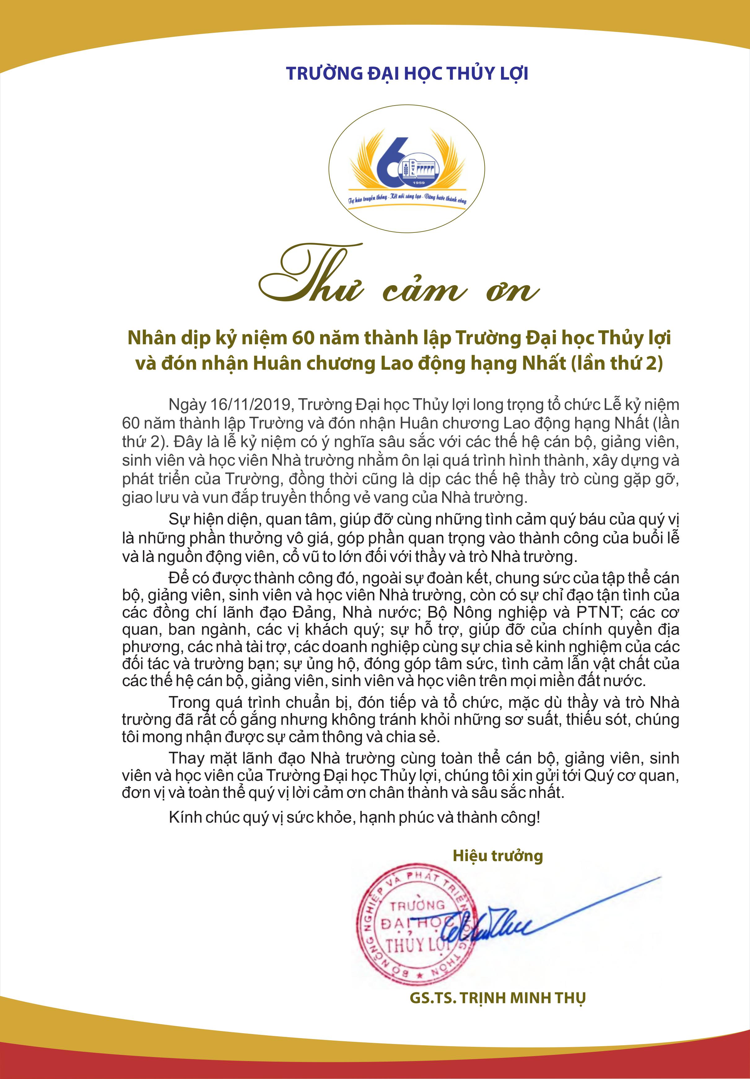 Thư cảm ơn của Trường Đại học Thủy lợi
