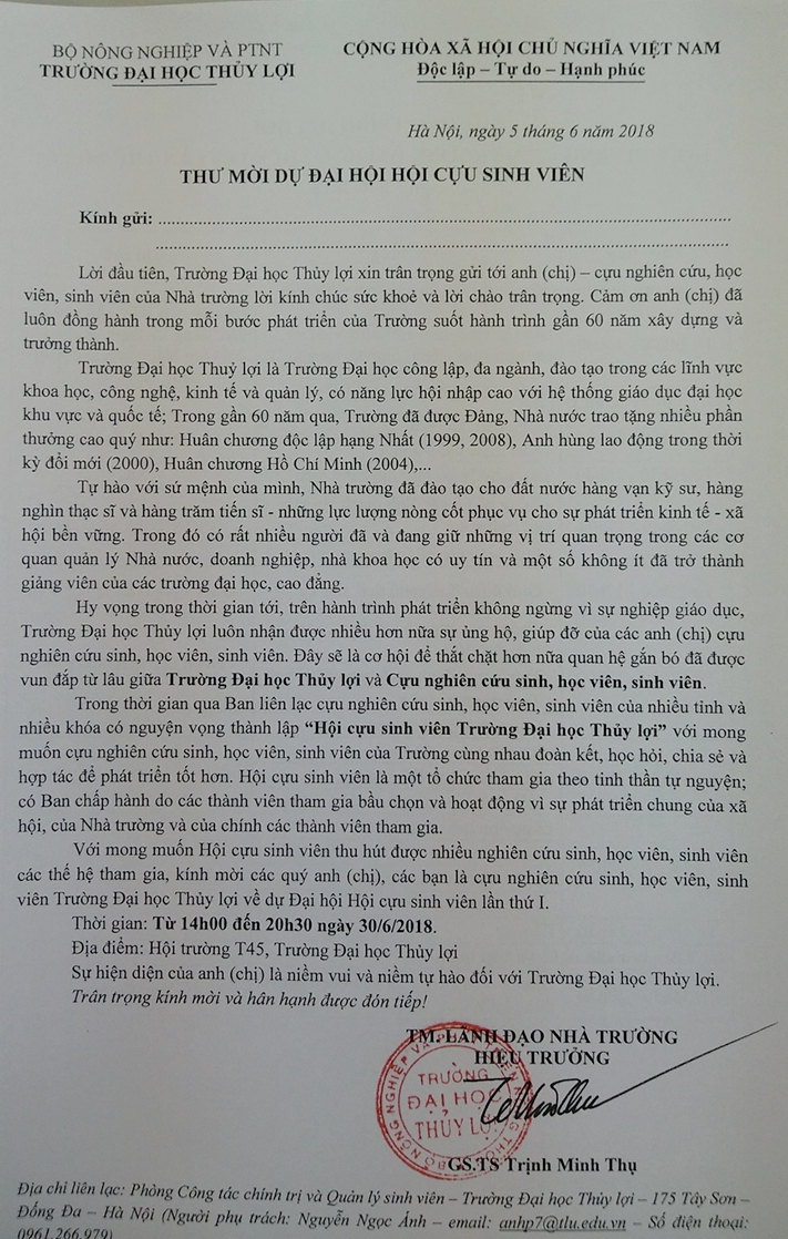 Kính gửi: Các anh (chị) cựu sinh viên trường Đại học Thủy lợi