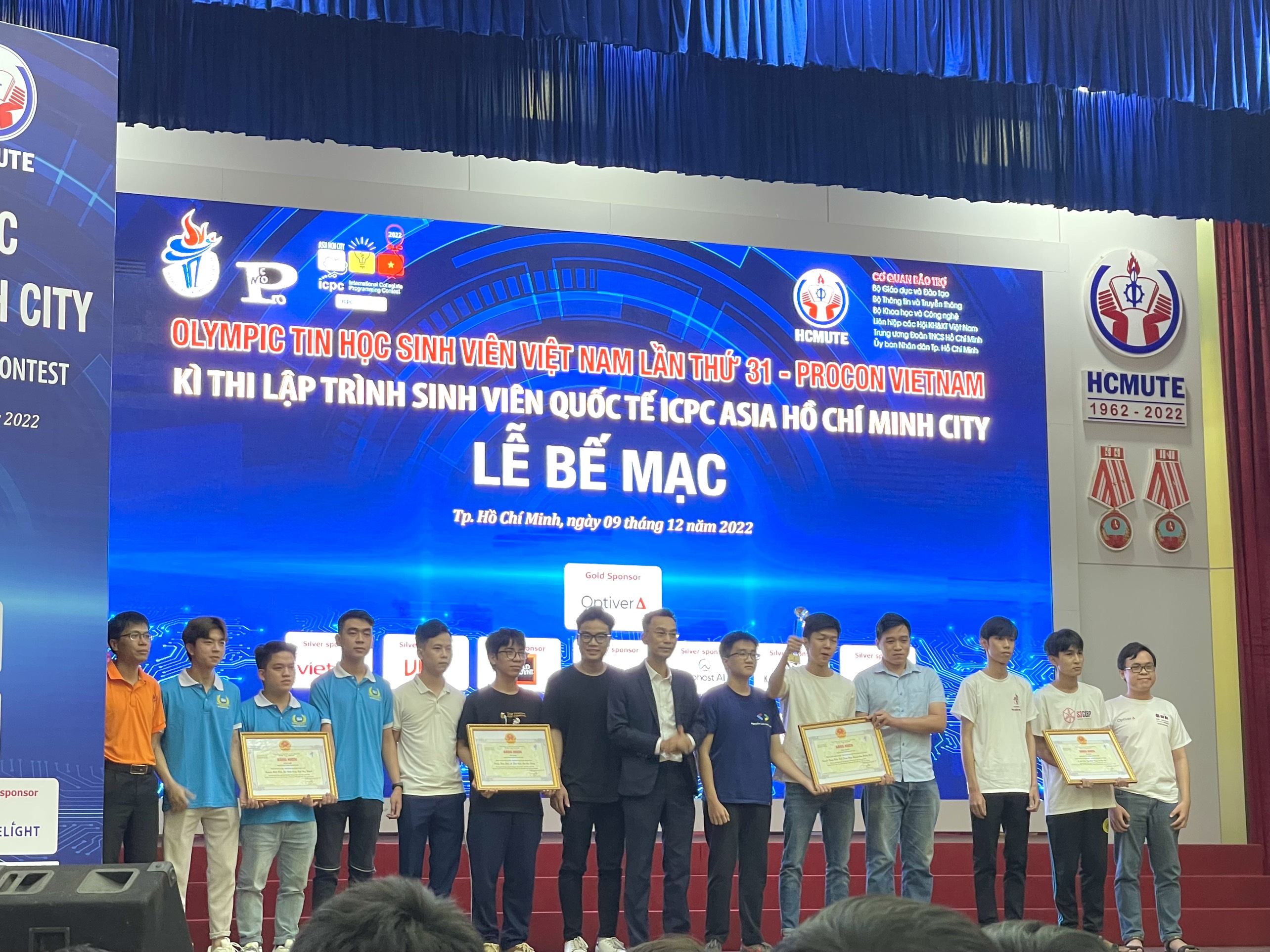 3 đại diện của Trường Đại học Thủy lợi gồm sinh viên Nguyễn Minh Hiếu, Mai Đình Công, Ngô Duy Khánh lớp 61HT trong màu áo xanh đồng phục đội tuyển nhận giải Nhì khối phần mềm nguồn mở