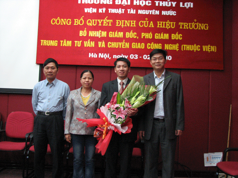 Sáng ngày 3/2/2010 tại phòng 123 đã diễn ra lễ công bố quyết định của hiệu trưởng trường Đại học Thủy Lợi: Bổ nhiệm giám đốc, Phó giám đốc Trung tâm tư vấn và chuyển giao công nghệ thuộc Viện kỹ thuật tài nguyên nước. Đến dự buổi lễ có sự hiện diện của PGS.TS Trần Viết Ổn – trưởng khoa Kỹ thuật tài nguyên nước, viện trưởng Viện kỹ thuật tài nguyên nước; lãnh đạo Viện cùng đại diện một số Phòng ban và đại diện của Trung tâm tư vấn và chuyển giao công nghệ. Toàn cảnh...