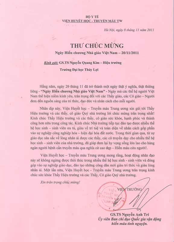 Thư chúc mừng ngày Hiến chương Nhà giáo Việt Nam của Viện Huyết học – Truyền máu trung ương