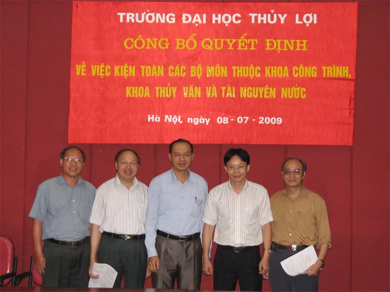 Ngày 08/07/2008, lễ công bố quyết định kiện toàn các Bộ môn thuộc Khoa Thủy văn – Tài nguyên nước và Khoa Công trình long trọng diễn ra tại Hội trường 123 – Đại học Thủy lợi. Các quyết định của Hiệu trưởng đã được công bố bao gồm: *Tổ chức lại các Bộ môn thuộc Khoa Thủy văn và Tài nguyên nước thành các Bộ môn mới như sau: 1. Bộ môn Kỹ thuật sông và Quản lý thiên tai 2. Bộ môn Thủy văn và Tài nguyên nước 3. Bộ môn Mô hình toán và Dự báo Khí...