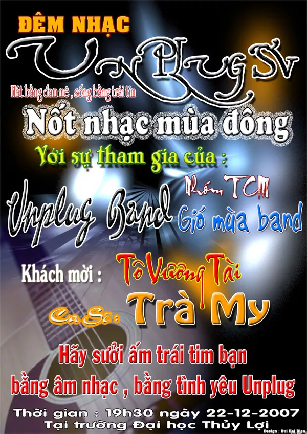 Thiết thực chào mừng ngày truyền thống Học sinh – Sinh viên 09/01, hướng tới Đại hội đại biểu Hội Sinh Viên trường nhiệm kỳ XIII, đặc biệt chào đón lễ Giáng sinh, được sự đồng ý của Đảng ủy – Ban giám hiệu trường Đại Học Thủy Lợi, Ban thư ký Hội Sinh Viên trường tổ chức chương trình ca nhạc mang tên “Đêm nhạc Unplug SV-nốt nhạc mùa đông”. (Hoàn toàn miễn phí ) vào lúc 19h30 ngày 22 tháng 12 năm 2007 tại sân khấu ngoài trời trước Hội trường T45. Chương trình sẽ có sự góp...