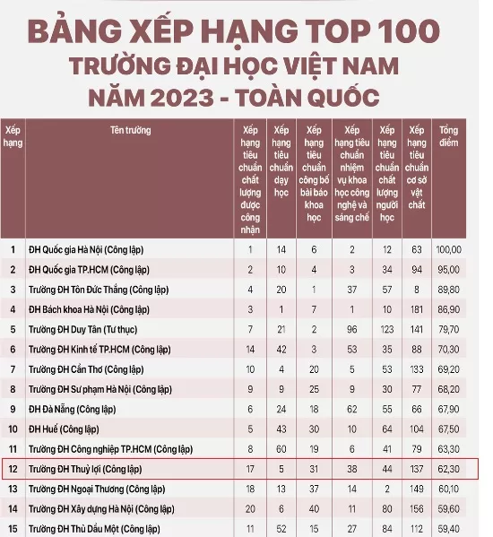 Trường Đại học Thủy lợi xếp hạng thứ 12 trong số các trường Đại học Việt Nam năm 2023