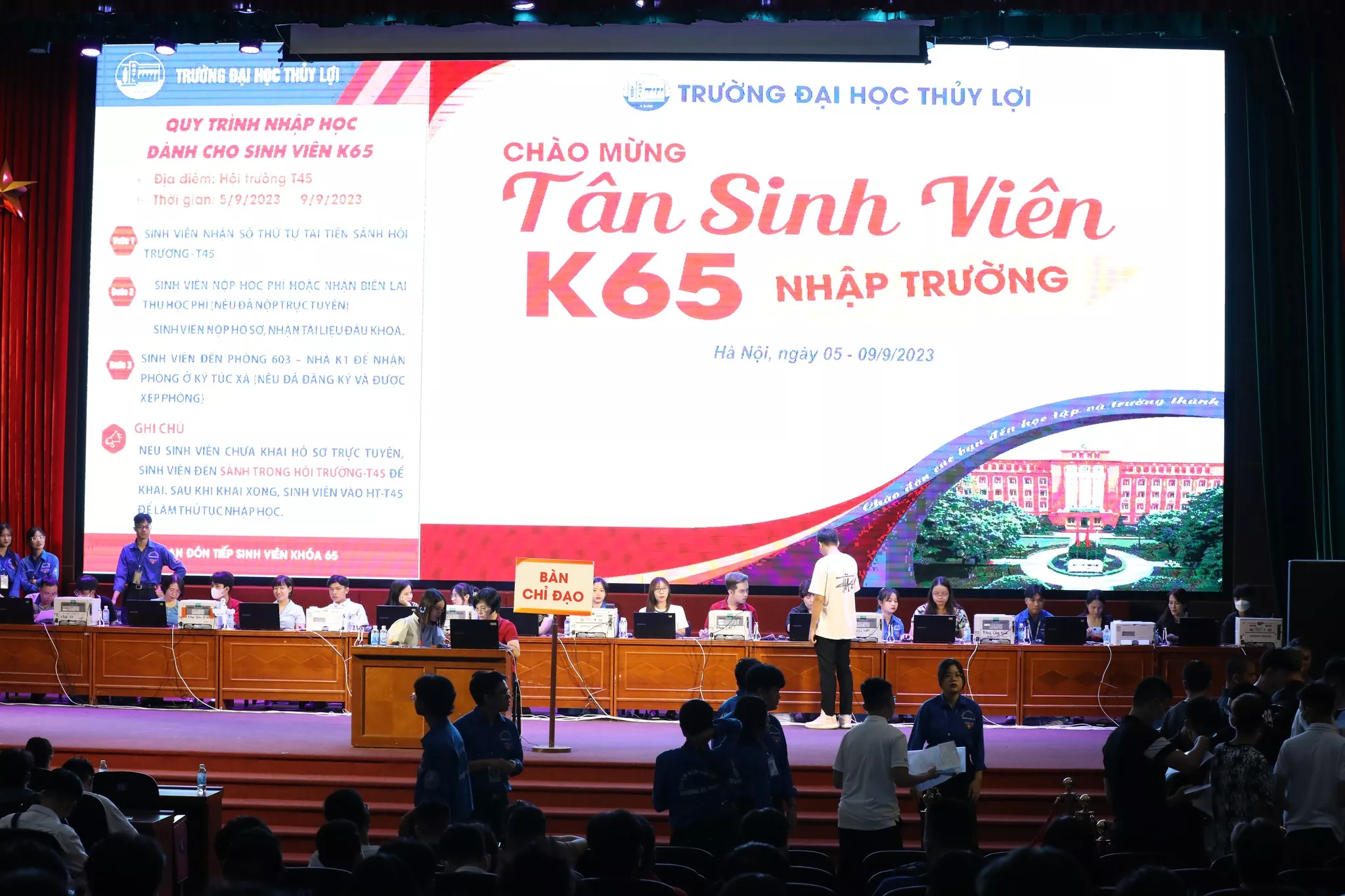 Nhằm tạo điều kiện thuận lợi cho các tân sinh viên nhập học, Trường Đại học Thủy lợi đã xây dựng kế hoạch, bố trí hội trường T45 để đón tiếp. Hàng chục cán bộ, chuyên viên các Phòng ban luôn đảm bảo trực thông suốt trong thời gian sinh viên nhập học; có mặt tại vị trí tư vấn và bàn tiếp nhận hồ sơ giúp các em có thể làm thủ tục nhanh chóng, hiệu quả. Bên cạnh đó, đội ngũ sinh viên tình nguyện được Nhà trường tập huấn kỹ năng đã hỗ trợ tân sinh viên và người nhà...