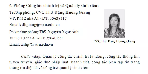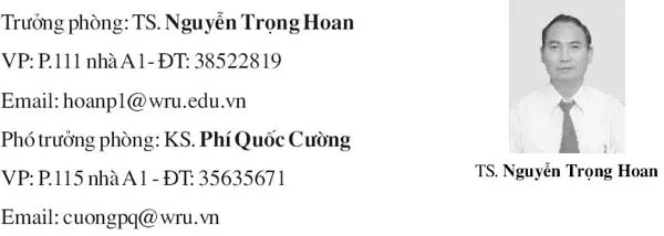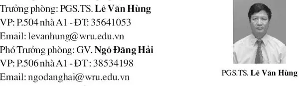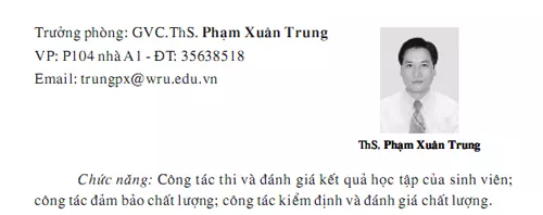 Phòng Khảo thí và Đảm bảo chất lượng Trưởng phòng: TS. Trương Quốc Quân Phó trưởng phòng: ThS Đặng Tuyết Minh VP: P104, 106 nhà A1 – ĐT: 35642521 Chức năng: Công tác thi và đánh giá kết quả học tập của sinh viên; công tác đảm bảo chất lượng; công tác kiểm định và đánh giá chất lượng.