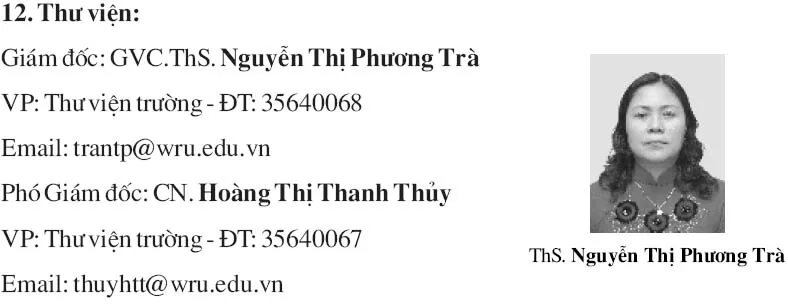 Giám đốc: GVC.Ths. Nguyễn Thị Phương Trà VP: Thư viện trường – ĐT: 04.35640068 Email: [email protected] CHỨC NĂNG NHIỆM VỤ THƯ VIỆN ĐẠI HỌC THỦY LỢI A. Chức năng, nhiệm vụ chung 1- Chức năng Giúp việc Hiệu trưởng về các công tác: – Công tác thông tin thư viện; – công tác phục vụ độc giả tại Thư viện: Cho mượn tài liệu, giáo trình phục vụ giảng dạy, nghiên cứu và học tập đối với CBVC và sinh viên của trường 2- Nhiệm vụ cụ thể: (1) Xây dựng và thực hiện kế hoạch dài...