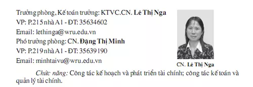 Phòng Tài chính – Kế toán Trưởng phòng, Kế toán trưởng: THS. Lê Thanh Tùng VP: P215 nhà A1 – ĐT: 04.35634602 Phó Trưởng phòng: CN. Đặng Thị Minh VP: P219 nhà A1 – ĐT: 04.35639190 Email: [email protected] Chức năng: Công tác kế hoạch và phát triển tài chính; công tác kế toán và quản lý tài chính .
