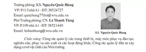 Phòng Quản trị Trưởng phòng: KS. Hoàng Quốc ThịnhVP: P.109 nhà A1- ĐT: 38522819Email: [email protected]ó trưởng phòng: KS. Phí Quốc CườngVP: P.113 nhà A1 – ĐT: 35635671Email: [email protected] Chức năng: Công tác về quản lý cơ sở vật chất, hạ tầng của cơ quan như đất đai, nhà cửa, đường giao thông, các công trình công cộng, trang thiết bị …; công tác phục vụ, đảm bảo các hoạt động của cơ quan như: điện, nước, xe, hội trường, trang thiết bị khu giảng đường …; vệ sinh môi trường; Công tác quản lý cơ sở vật...