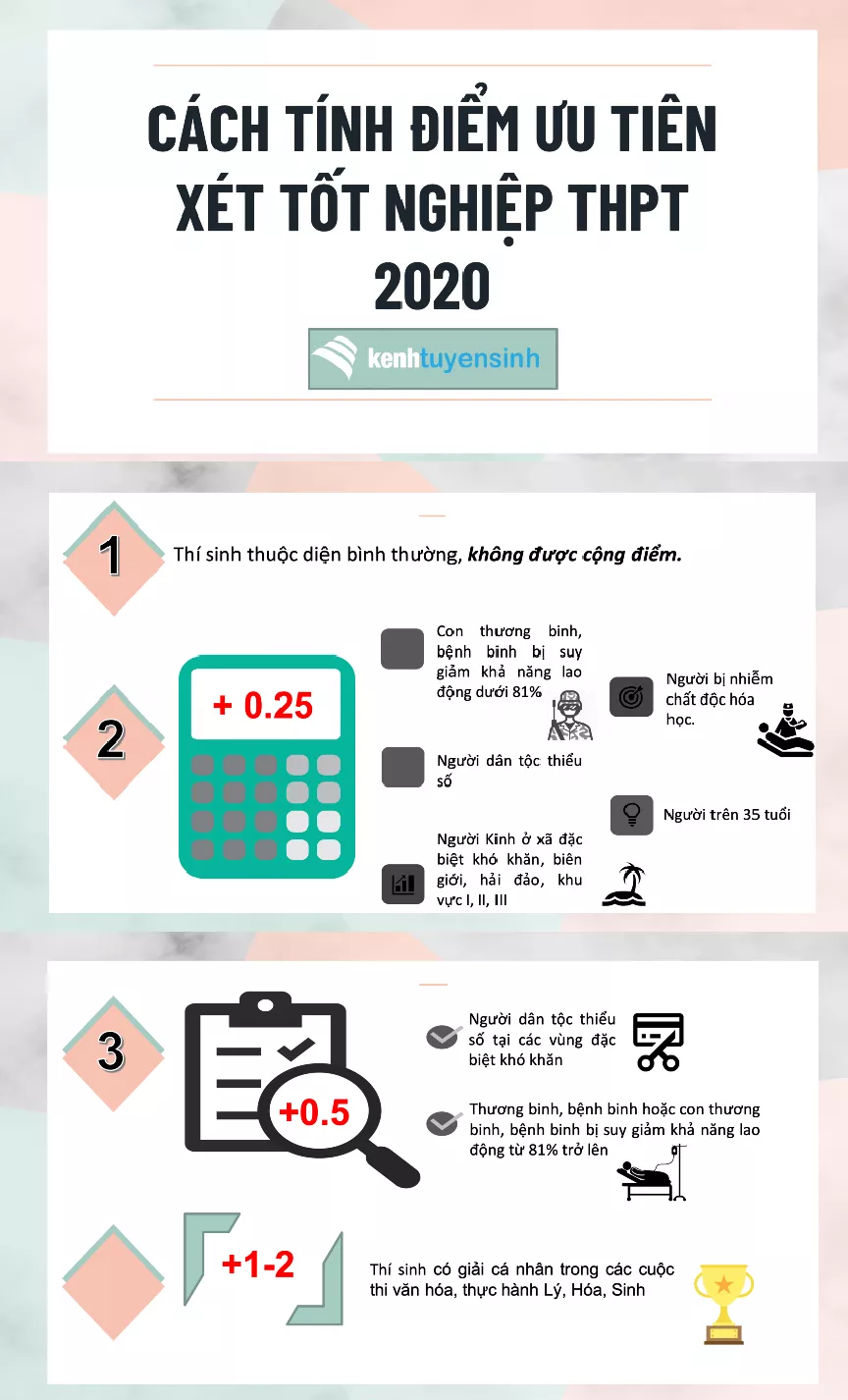 Cách tính điểm ưu tiên trong kỳ thi THPT 2020 Thí sinh diện 1, hay còn lại là diện bình thường, không được cộng điểm. Những thí sinh thuộc diện...