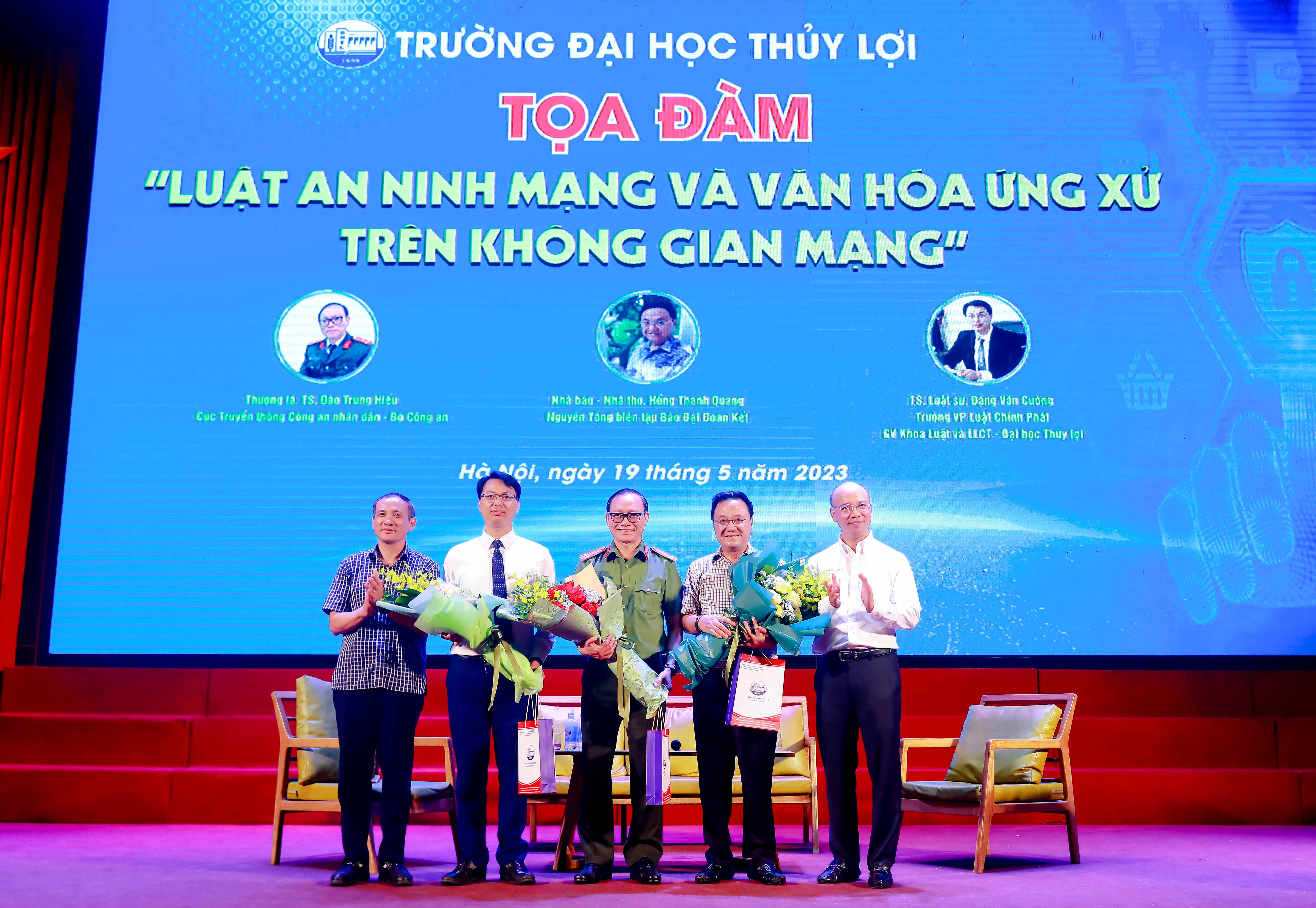 Lãnh đạo Trường Đại học Thủy lợi tặng hoa cảm ơn những chia sẻ ý nghĩa từ các khách mời