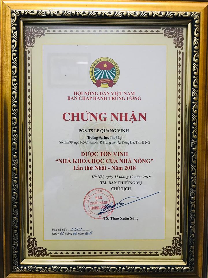 Trong suốt 38 năm công tác tại Trường Đại học Thủy lợi, PGS.TS Lê Quang Vinh đã tham gia vào công tác giảng dạy tại Khoa Kỹ thuật tài nguyên nước, tham gia hoạt động nghiên cứu phục vụ sản xuất tại Trung tâm Khoa học và Triển khai kỹ thuật Thủy lợi đã có nhiều đóng góp cho sự nghiệp giáo dục, ứng dụng khoa học kỹ thuật. Trong suốt những năm tháng qua ông đã biên soạn 01 Quy chuẩn Việt Nam về thiết kế công trình Thủy lợi; 27 Tiêu chuẩn Việt Nam trong đó có trên 10 tiêu chuẩn được biên soạn mới hoàn toàn… Với những thành tích đó PGS.TS Lê Quang Vinh đã vinh dự được nhận giải “Nhà khoa học của Nhà nông”.