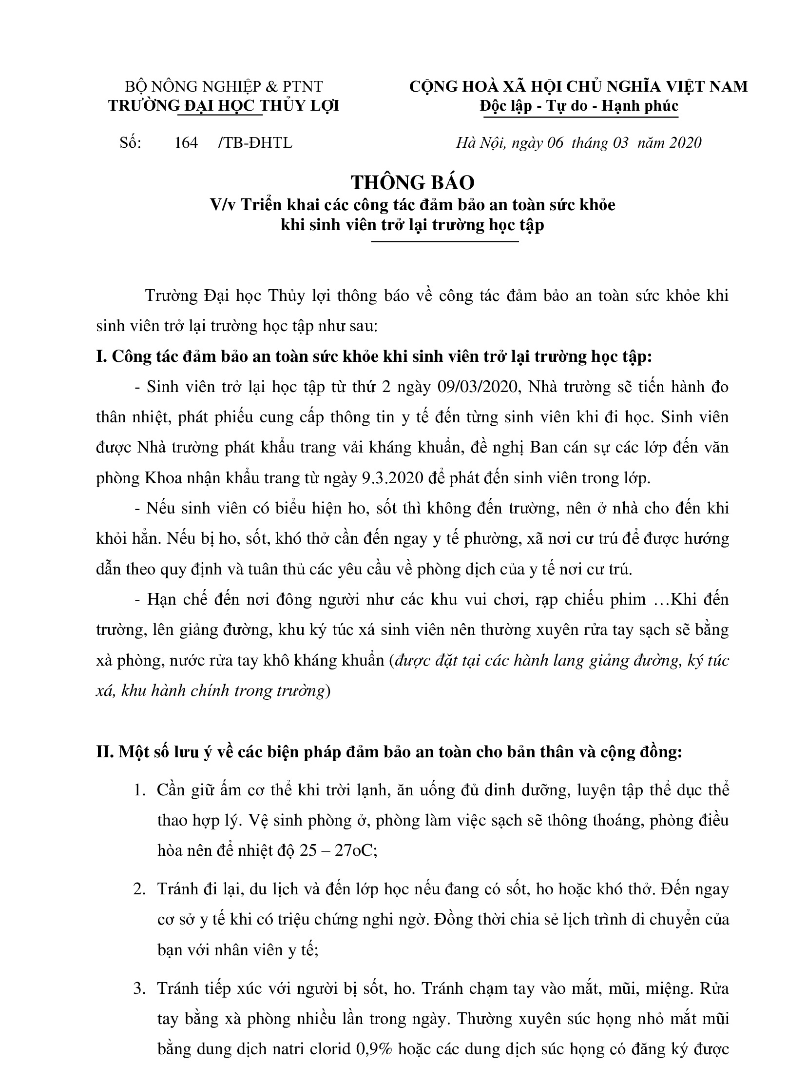 Sinh viên trở lại học tập từ thứ 2 ngày 09/03/2020, Nhà trường sẽ tiến hành đo thân nhiệt, phát phiếu cung cấp thông tin y tế đến từng sinh viên khi đi học. Sinh viên được Nhà trường phát khẩu trang vải kháng khuẩn, đề nghị Ban cán sự các lớp đến văn phòng Khoa nhận khẩu trang từ ngày 9.3.2020 để phát đến sinh viên trong lớp.