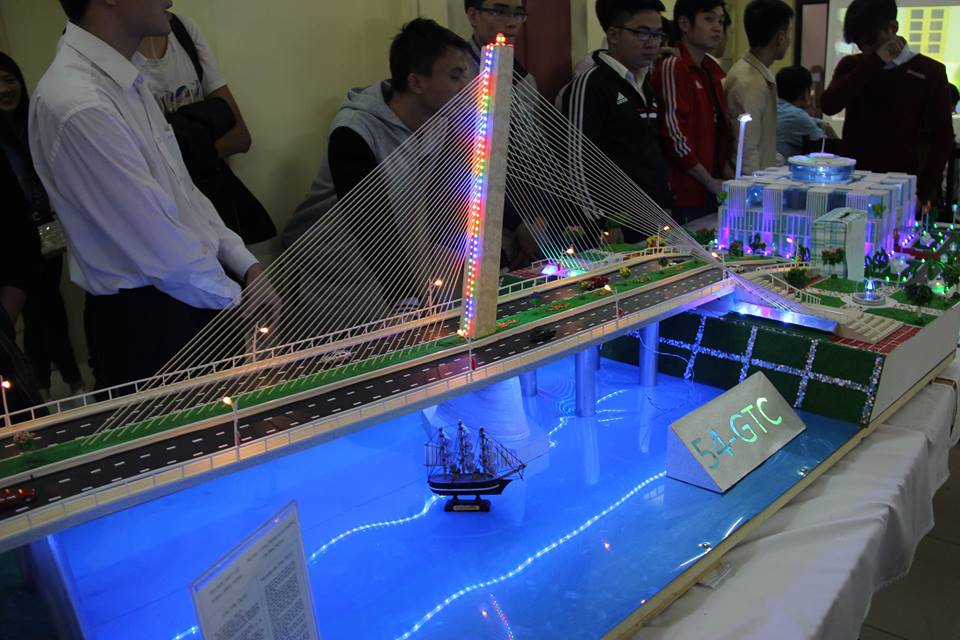 hay như mô hình Cầu quay sông Hàn của chi đoàn 55GT2 mô phỏng phần giữa của cây cầu quay 90o quanh trục, phục vụ giao thông thủy đi lại trên sông.