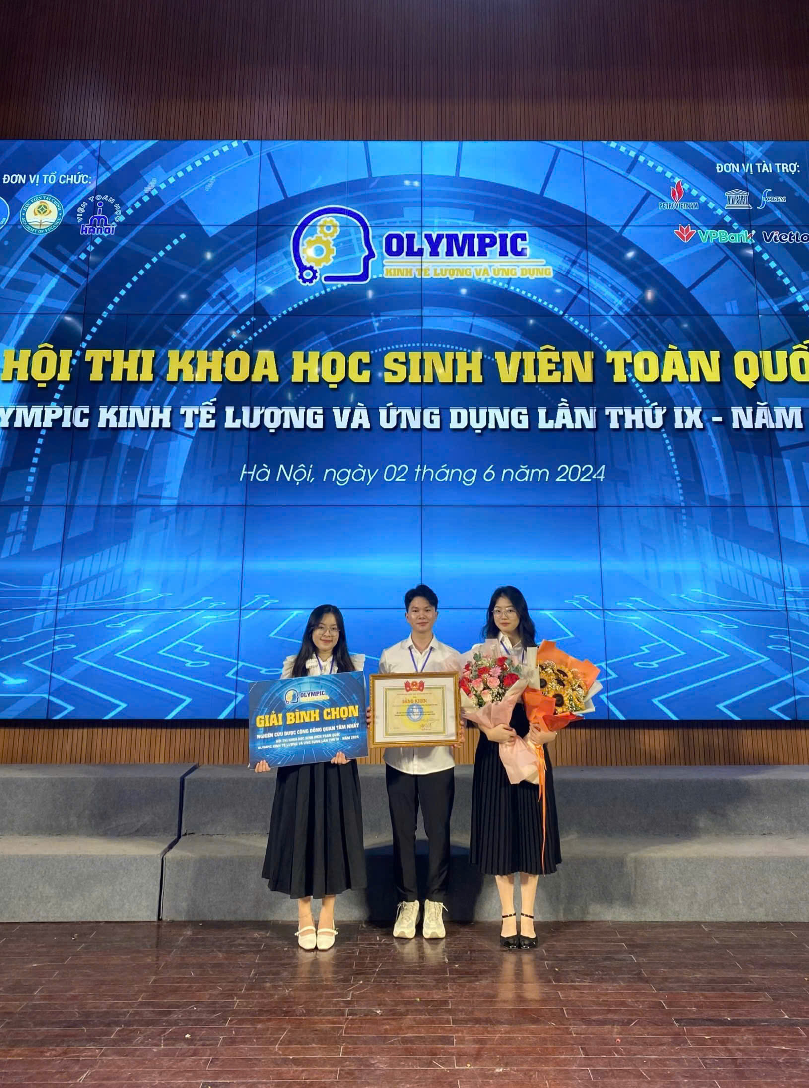 - Tham gia Hội thi Nghiên cứu khoa học sinh viên Olympic Kinh tế lượng và Ứng dụng toàn quốc lần thứ 9 năm 2024 với hai đề tài và xuất sắc đạt ba giải: Giải Nhì, Giải Khuyến khích và Giải Đề tài được quan tâm nhất;