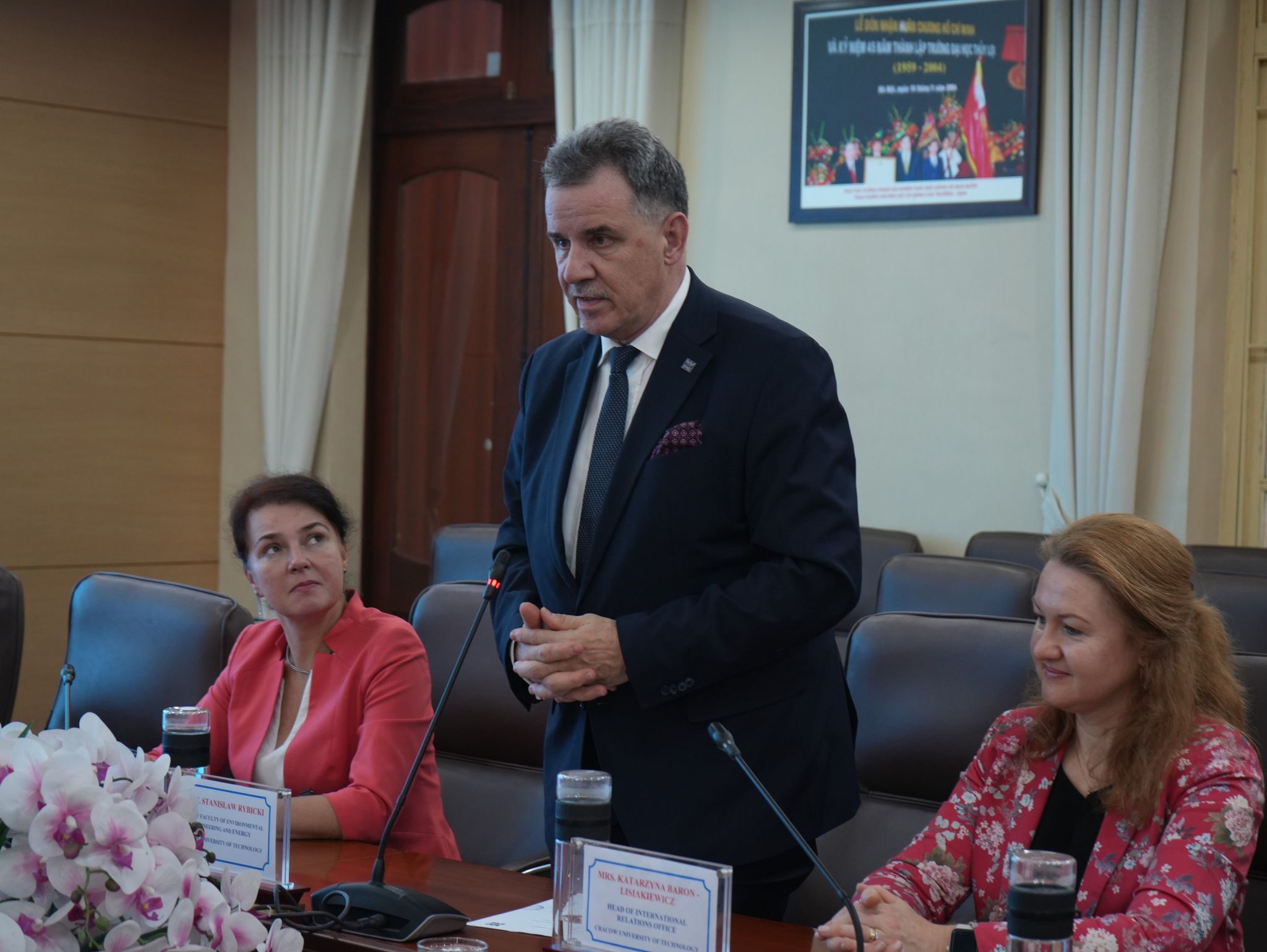 Sau bài phát biểu khai mạc và giới thiệu về trường ĐHTL của GS. Trịnh Minh Thụ – Hiệu Trưởng, GS. Stanislaw RYBICKI – Trưởng Khoa kỹ thuật môi trường và Năng lượng (CUT) thay mặt đoàn đại biểu bày tỏ lòng cảm ơn sâu sắc tới Ban lãnh đạo Nhà trường đã tiếp đón nồng hậu, chu đáo. GS. Stanislaw và Bà Katarzyna đã có bài chia sẻ giới thiệu về Đại học CUT với những thành tích nội bật trong các ngành kỹ thuật. Trường CUT đã ký hơn 290 hiệp định song phương với các trường đại học ở 53 quốc gia, được xếp hạng cao trong nhiều bảng xếp hạng quốc tế uy tín như Shanghai Ranking’s Global Ranking, QS World University Rankings …Trường có nhiều chính sách ưu đãi và thu hút sinh viên quốc tế từ nhiều nước trên thế giới đến học tập và trải nghiệm. Các chương trình được đào tạo bằng tiếng Anh, cung cấp chuyên môn sâu cũng như các khóa học 2-3 tuần về ngôn ngữ và văn hóa Ba Lan dành cho sinh viên quốc tế muốn tìm hiểu thêm về Ba Lan trước khi họ cam kết học hoặc nghiên cứu sau đại học tại châu Âu.