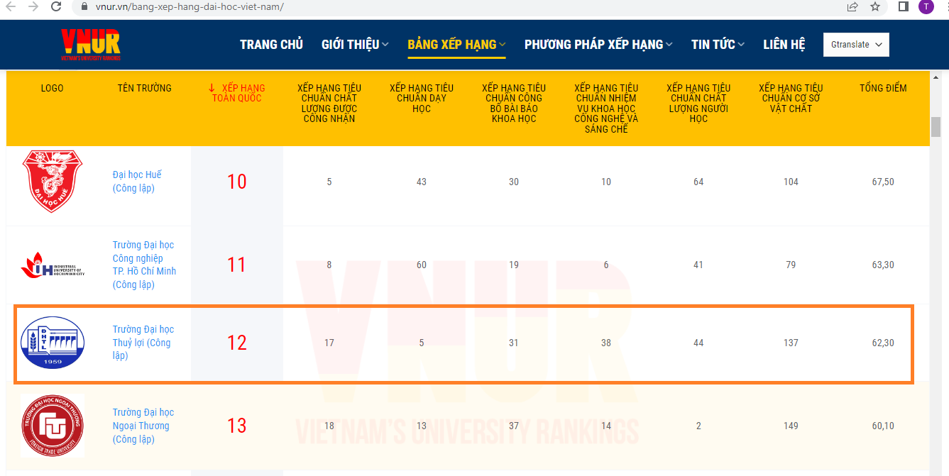 Viet Nam’s University Rankings (VNUR) – là bảng xếp hạng các cơ sở giáo dục đại học của Việt Nam – đã công bố Top 100 cơ sở giáo dục đại học trên lãnh thổ Việt Nam năm 2023.
