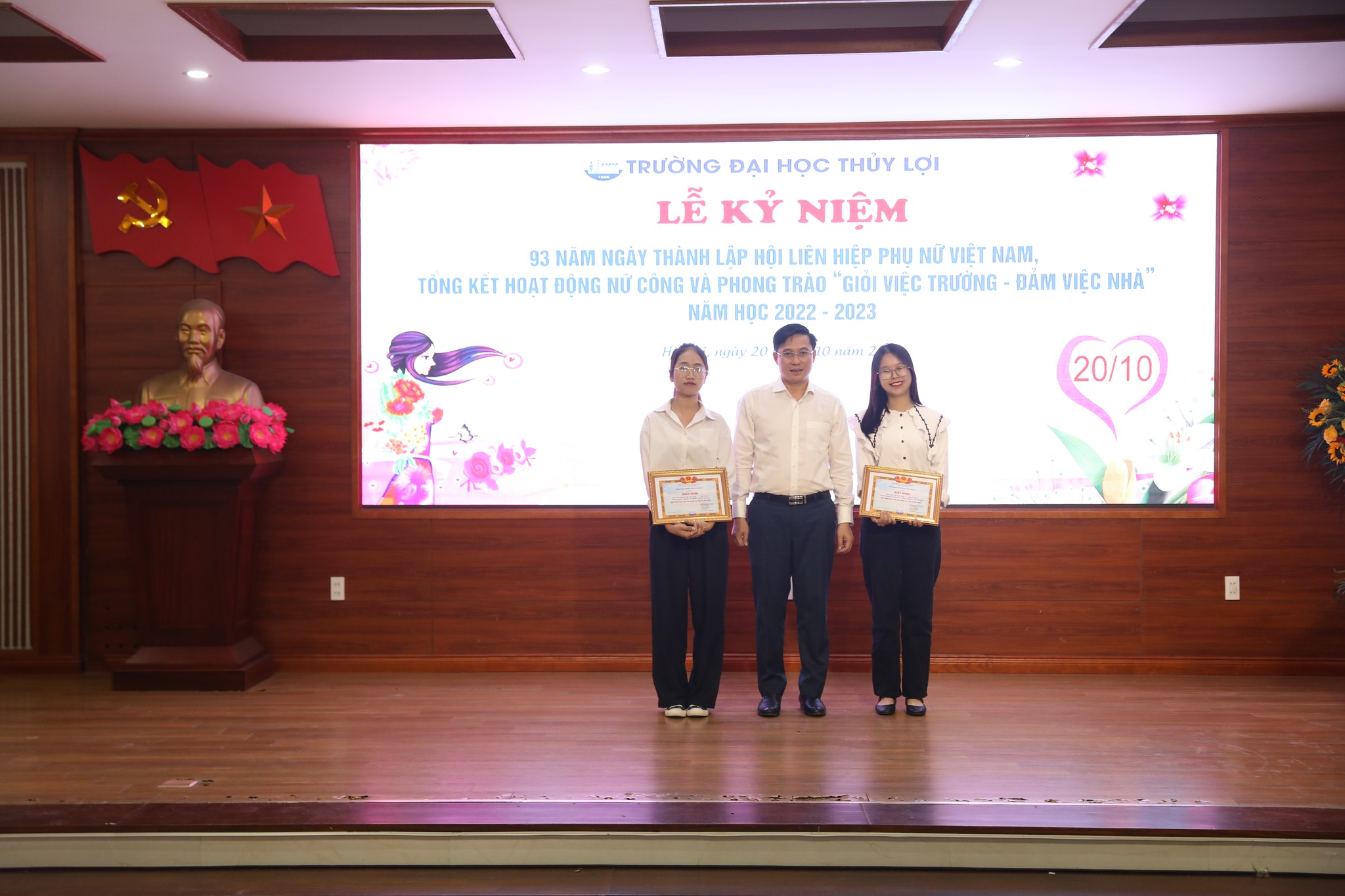 Nhân dịp này, Nhà trường tôn vinh những phụ nữ xuất sắc tại Trường Đại học Thủy lợi. Trong buổi lễ, Ban chấp hành Công đoàn trường được công bố và trao tặng danh hiệu thi đua “Giỏi việc Trường – Đảm việc nhà” năm học 2022-2023 cho nữ cán bộ viên chức trong trường. Các chị em nữ đã đạt danh hiệu Phó Giáo sư, Tiến sĩ trong năm học 2022-2023 cũng được vinh danh trong dịp này.