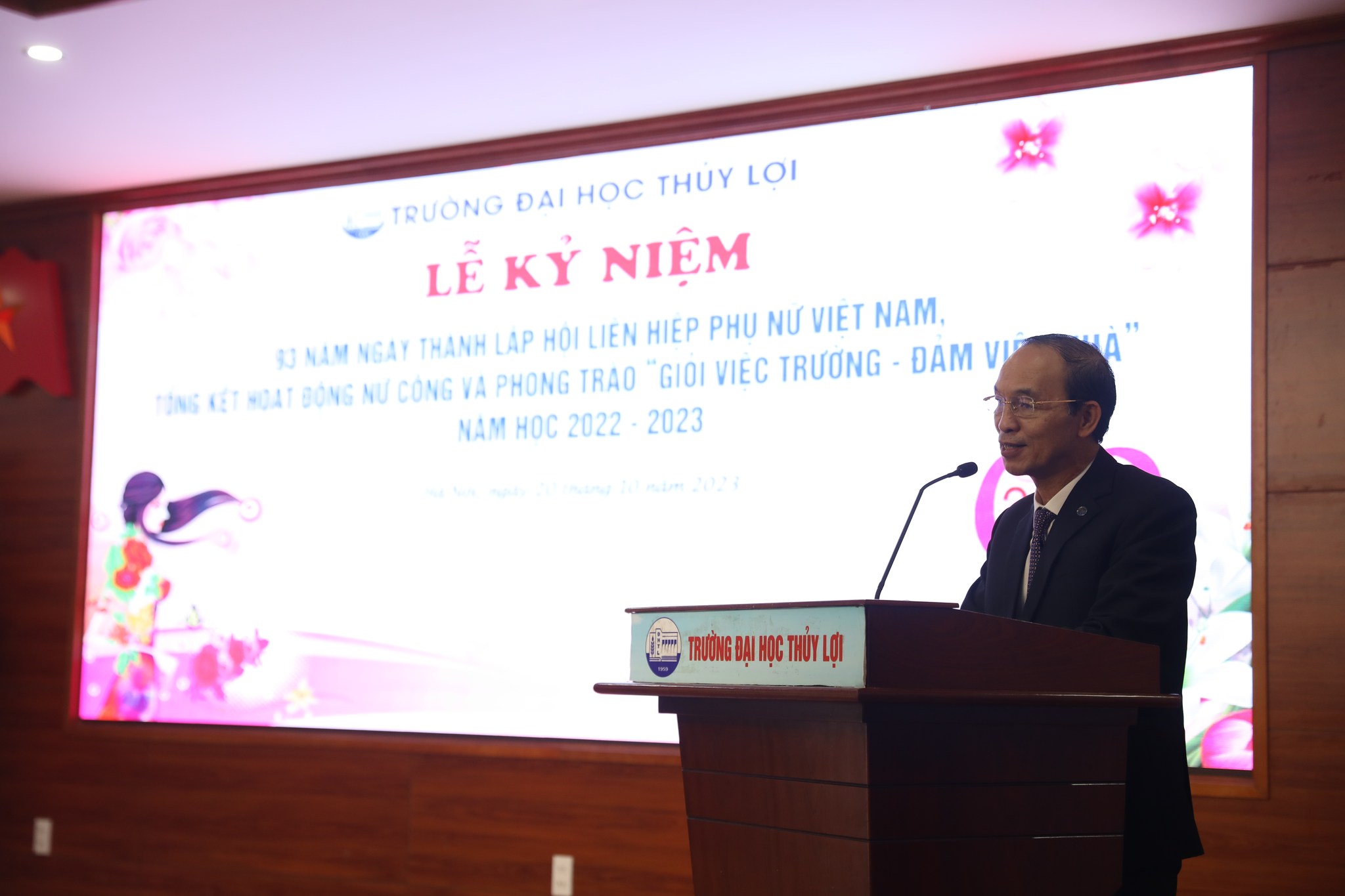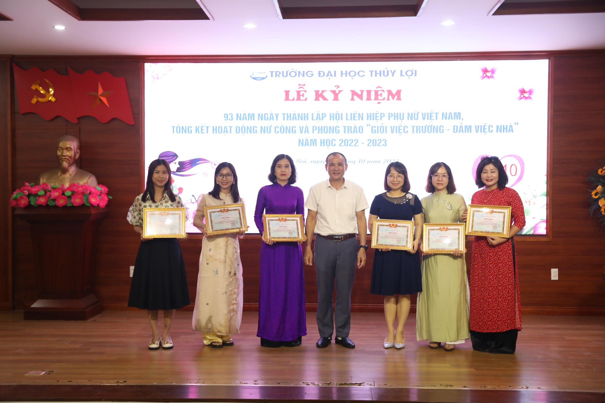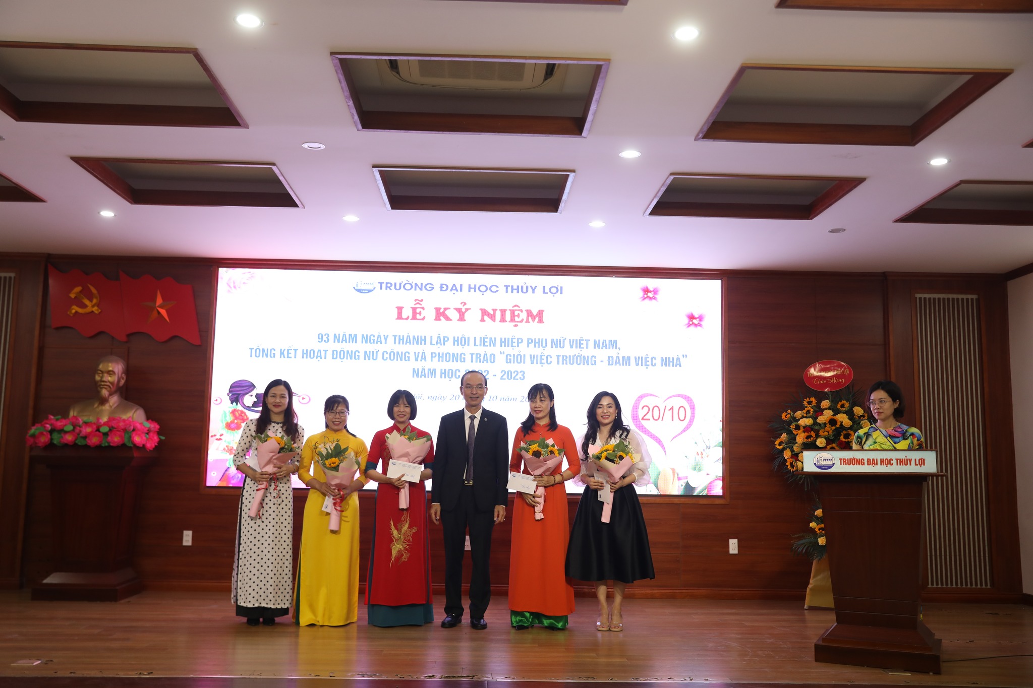 Nhân dịp này, Nhà trường tôn vinh những phụ nữ xuất sắc tại Trường Đại học Thủy lợi. Trong buổi lễ, Ban chấp hành Công đoàn trường được công bố và trao tặng danh hiệu thi đua “Giỏi việc Trường – Đảm việc nhà” năm học 2022-2023 cho nữ cán bộ viên chức trong trường. Các chị em nữ đã đạt danh hiệu Phó Giáo sư, Tiến sĩ trong năm học 2022-2023 cũng được vinh danh trong dịp này.
