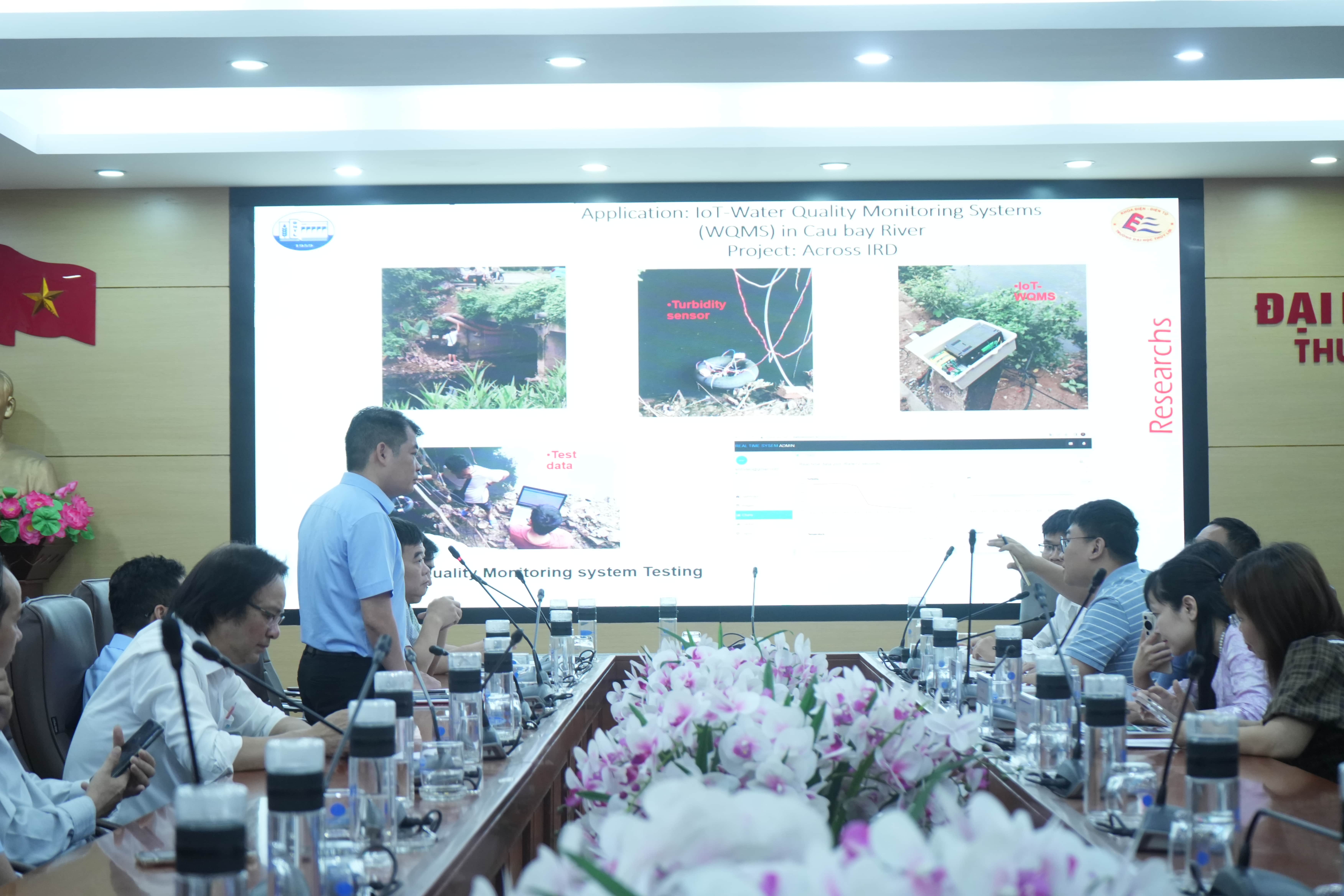 Bước sang phiên thảo luận chuyên sâu, hai bên tiếp tục thảo luận tích cực về các khía cạnh hợp tác tiềm năng. TS. Nguyễn Nhất Tùng giới thiệu về Khoa Điện – Điện tử, với các ngành đào tạo như Kỹ thuật điện – điện tử, Kỹ thuật điều khiển và tự động hóa, Kỹ thuật điện tử – viễn thông, Hệ thống robot và trí tuệ nhân tạo, cùng những lĩnh vực mới như Công nghệ năng lượng tái tạo, IoT. Đội ngũ giảng viên của Khoa có trình độ cao (64% tiến sĩ) và những hướng nghiên cứu mũi nhọn như lưới điện thông minh, robot tự hành phục vụ nông nghiệp và phòng chống thiên tai, cũng như ứng dụng công nghệ IoT trong quản lý chất lượng môi trường.