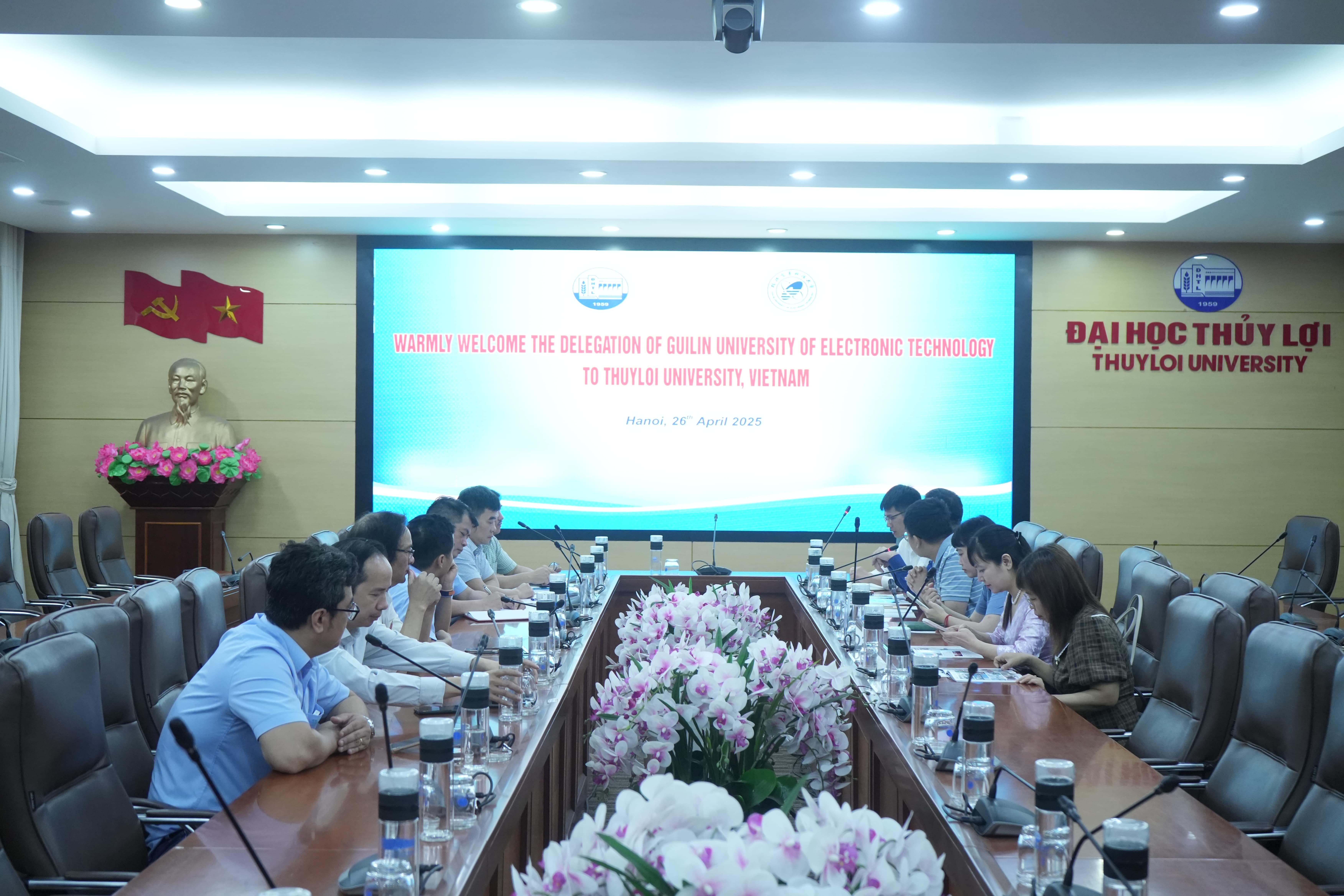 Phát biểu chào mừng, PGS. Nguyễn Cảnh Thái, Phó Hiệu trưởng Trường Đại học Thủy Lợi, nhấn mạnh rằng Việt Nam đang đặc biệt quan tâm đến phát triển các ngành công nghệ cao như bán dẫn và trí tuệ nhân tạo. Trường Đại học Thủy lợi mong muốn phối hợp với Đại học Công nghệ Điện tử Quế Lâm xây dựng các chương trình đào tạo mới phù hợp với xu thế phát triển toàn cầu, đồng thời đề xuất thành lập các nhóm chuyên gia nghiên cứu chung trong lĩnh vực quang điện. PGS. Nguyễn Cảnh Thái cũng chia sẻ những kinh nghiệm hợp tác nghiên cứu quốc tế trước đây của Nhà trường với phía Trung Quốc, tiêu biểu là các đề tài nghị định thư với Trung Quốc trong lĩnh vực thủy lợi và phòng chống thiên tai trong năm vừa qua, đồng thời bày tỏ mong muốn mở rộng hợp tác sang các lĩnh vực công nghệ cao.