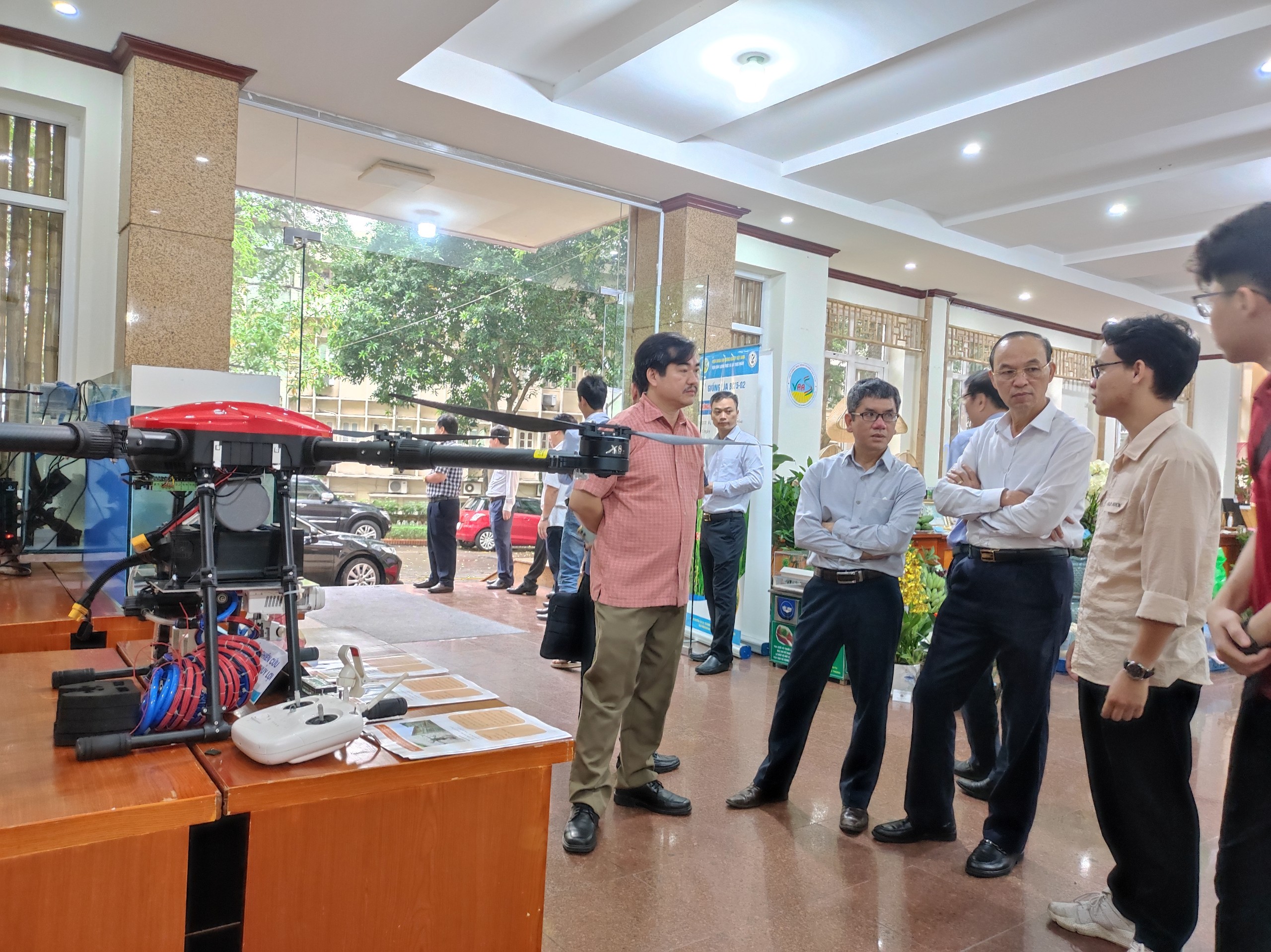 Lãnh đạo Phòng KHCN-HTQT giới thiệu thiết bị khảo sát UAV do các nhà khoa học trẻ của Trường nghiên cứu, chế tạo