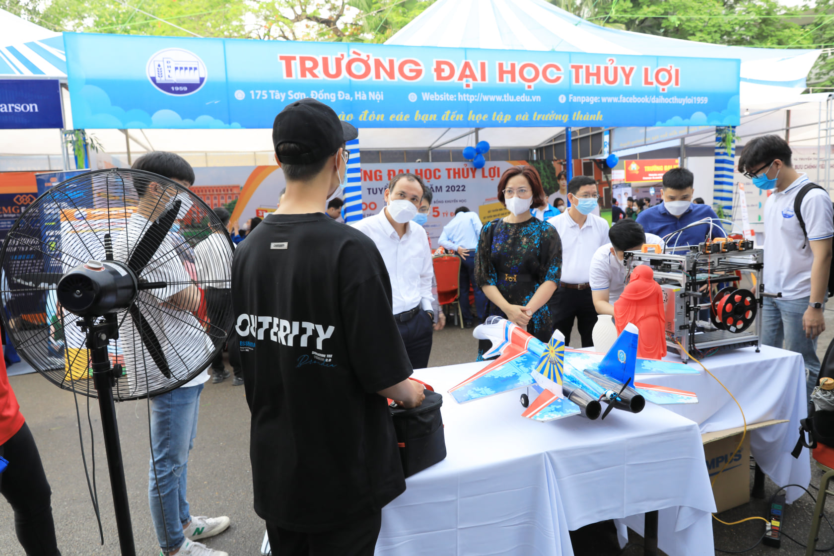 Tại gian của Trường Đại học Thủy lợi được các em học sinh chú ý nhiều nhất với những sản phẩm như: mô hình máy bay tự chế, robot trợ lý ảo, nhà rửa xe tự động, máy in 3D… Các sản phẩm này do chính sinh viên và giảng viên của trường thiết kế, điều hành. Và cũng tại đây đã tạo ra một khung cảnh náo nhiệt với những hoạt động phong phú như tư vấn trực tiếp từ các thầy cô giáo các ngành học, chụp ảnh cùng các nhân vật bằng bông, hỏi đáp về các sản phẩm công nghệ do thầy và trò Nhà trường tự nghiên cứu và chế tạo, tham gia vào các tiết mục biểu diễn nhảy hiện đại đầy sôi động.