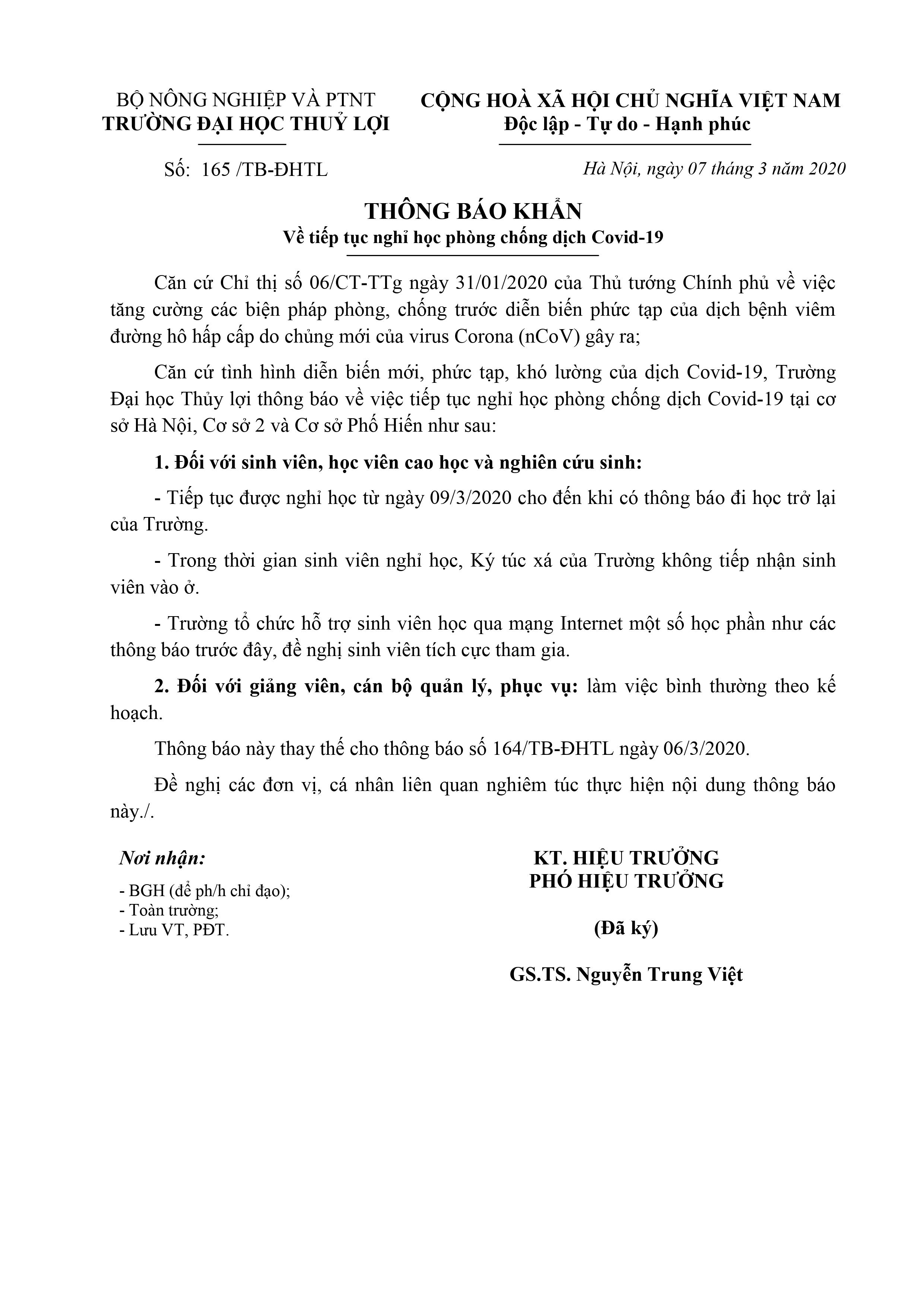 Trường Đại học Thủy lợi tiếp tục cho sinh viên nghỉ học phòng chống dịch Covid-19 Đăng vào 7 Tháng 3, 2020 bởi Data OldTheo Dõi Trường Đại Học Thủy Lợi Trên Mạng lưới Hợp tác Quốc tếNữ giảng viên Thủy lợi với lớp học online Bài viết cùng chủ đề: Thông báo tuyển sinh đi học tại Cu-Ba năm 2026 Thông báo kết quả cuộc thi sáng tác Slogan Trường Đại học Thủy lợi Thông báo kết quả Cuộc thi Thiết kế mẫu trang phục tốt nghiệp và đồng phục viên chức Trường Đại học Thủy lợi Thông báo về việc thu học phí học kỳ 1 năm học 2025 – 2026 Thông báo Hưởng ứng Cuộc thi trực tuyến “Tìm hiểu Luật Phòng, chống tác hại của thuốc lá” Kế hoạch xét chọn sinh viên nhận học bổng Hessen, CHLB Đức năm học 2025-2026 Công ty Cổ phần tư vấn xây dựng công trình giao thông 2 tuyển dụng Quyết định ban hành Quy định về thi Olympic các môn học của Trường Đại học Thủy lợi