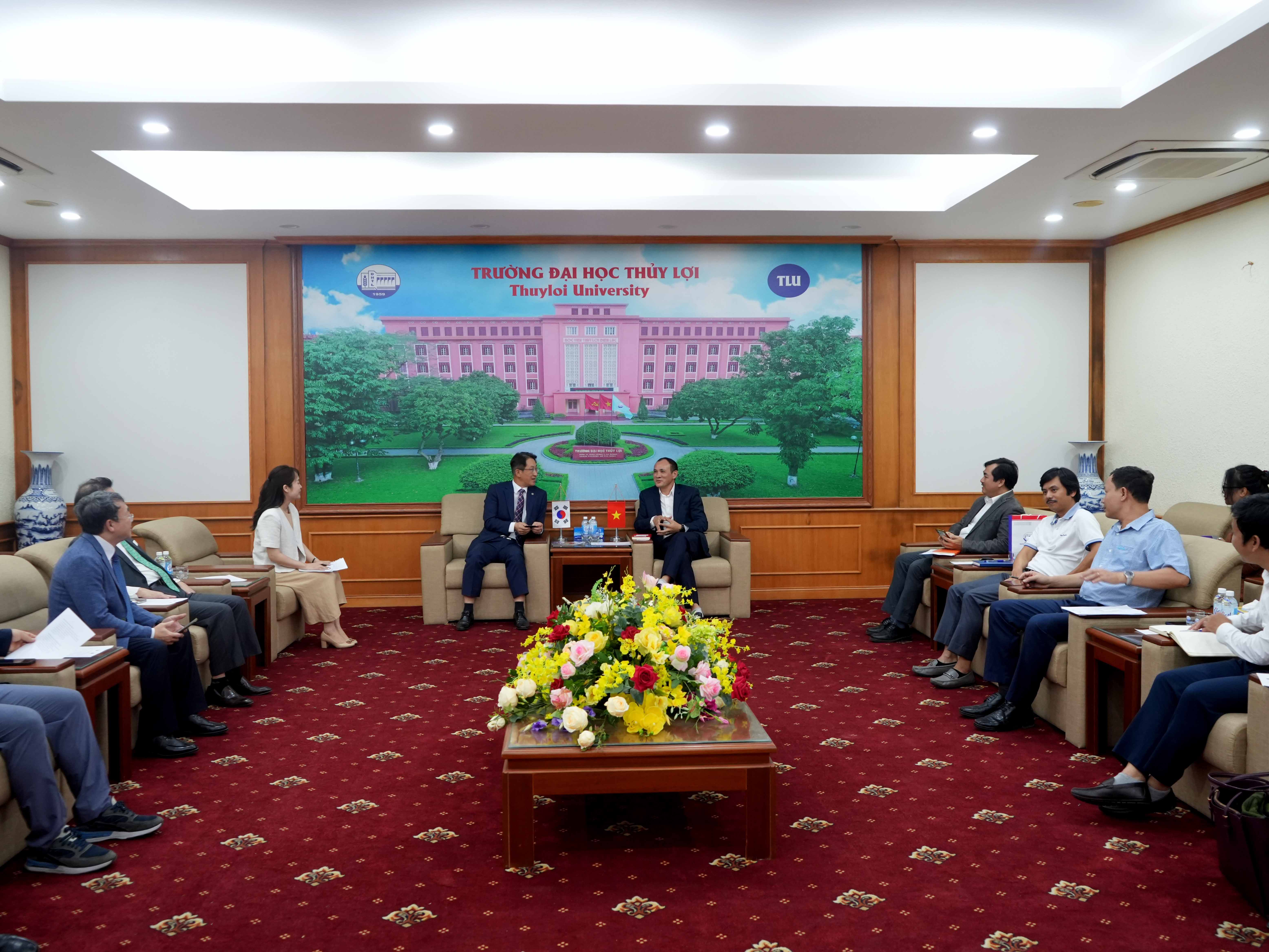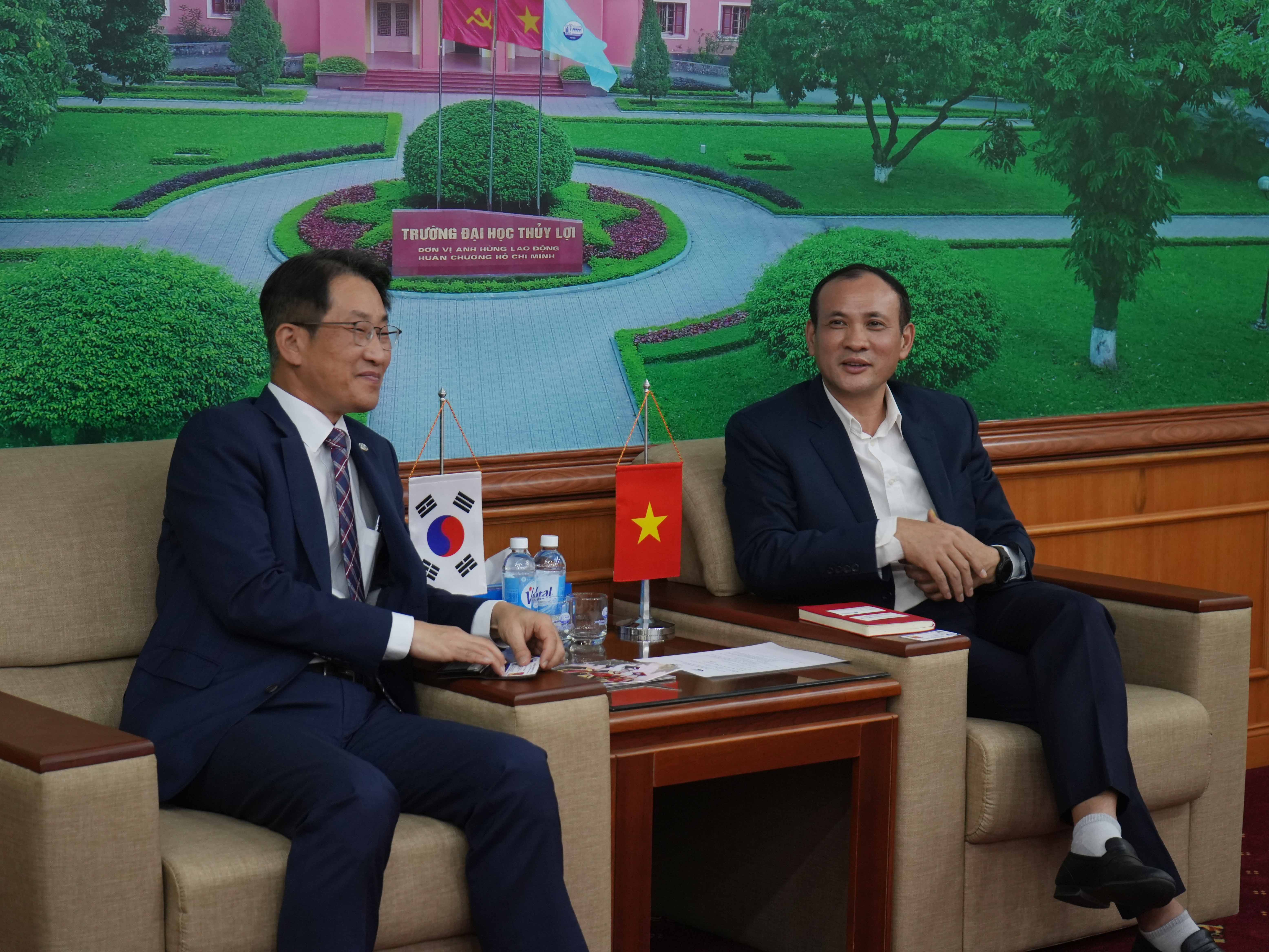 Trong buổi làm việc, đại diện lãnh đạo hai bên đã bàn về hướng triển khai các nội dung hợp tác có trong MoU đã ký vào giữa tháng 9/2023. Đề xuất chi tiết để MoU đạt được mục tiêu đã đề ra cho đào tạo nguồn nhân lực. Cụ thể bao gồm: Chương trình trao đổi sinh viên, giảng viên giữa 2 trường (Internship Program); Trao đổi những ấn phẩm học thuật, tài liệu nghiên cứu và những thông tin khác; Thiết lập và triển khai chương trình 2+2 đối với chương trình cử nhân và kỹ sư; Tạo điều kiện hợp tác học thuật và giáo dục, trao đổi chương trình giảng dạy; Huy động sự hợp tác đào tạo kỹ năng nghề cho sinh viên Trường Đại học Thủy lợi; Hợp tác tổ chức hội thảo chuyên đề quốc tế; xây dựng dự án nghiên cứu khoa học và chuyển giao nghiên cứu ứng dụng chung. Ngoài ra còn hỗ trợ triển khai chương trình giảng dạy tiếng Hàn Quốc, trong thời gian tới có thể cử giảng viên sang giảng dạy tiếng cho các cử nhân/ kỹ sư tham gia du học Hàn Quốc theo chương trình 2+2, trao tặng những ấn phẩm tiếng Hàn để sinh viên có thêm tài liệu học tập.