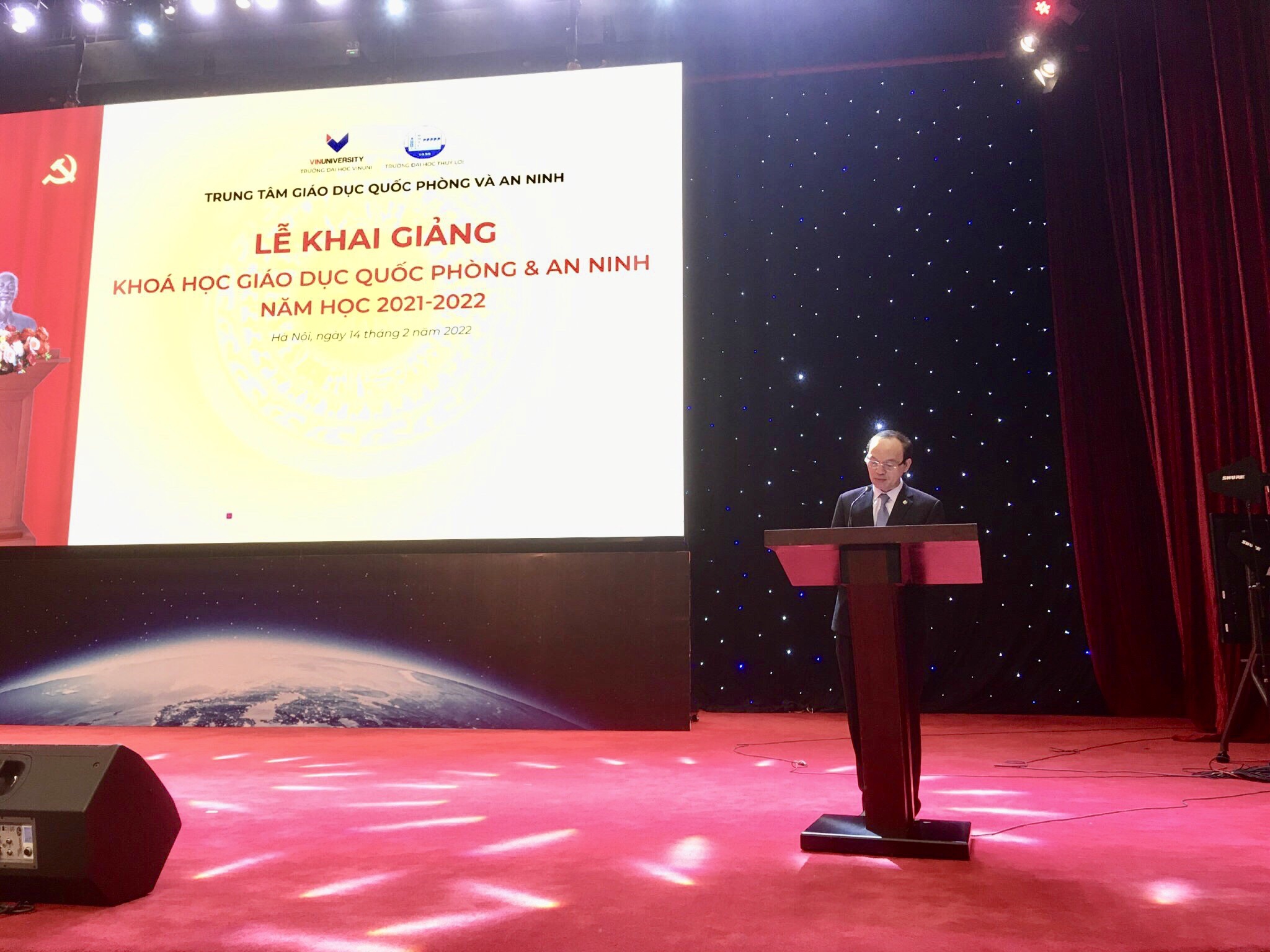 Phát biểu khai giảng, GS. David Harrison, Phó hiệu trưởng Trường Đại học VinUni cũng khẳng định vai trò và ý nghĩa của việc giảng dạy môn học Giáo dục quốc phòng và an ninh trong trường học. Đồng thời bày tỏ vui mừng khi được phối hợp với Trường Đại học Thủy lợi tổ chức khóa học Giáo dục quốc phòng & an ninh năm học 2021-2022 cho hơn 400 sinh viên khóa 01 và 02 của trường Đại học VinUni.
