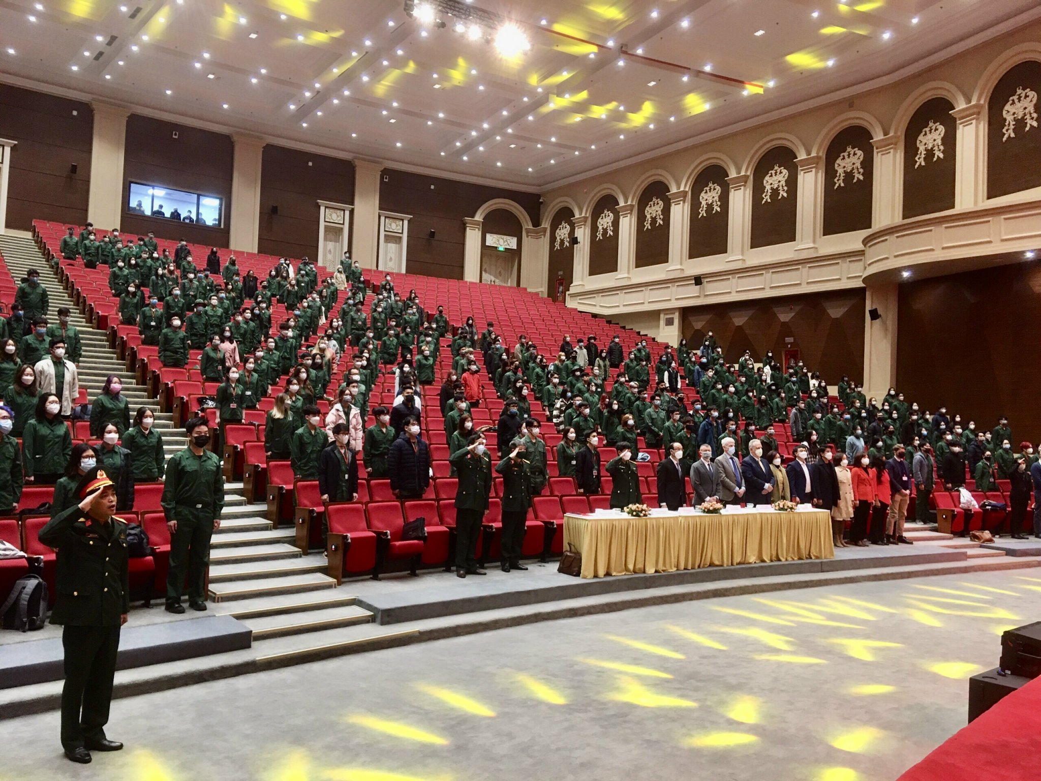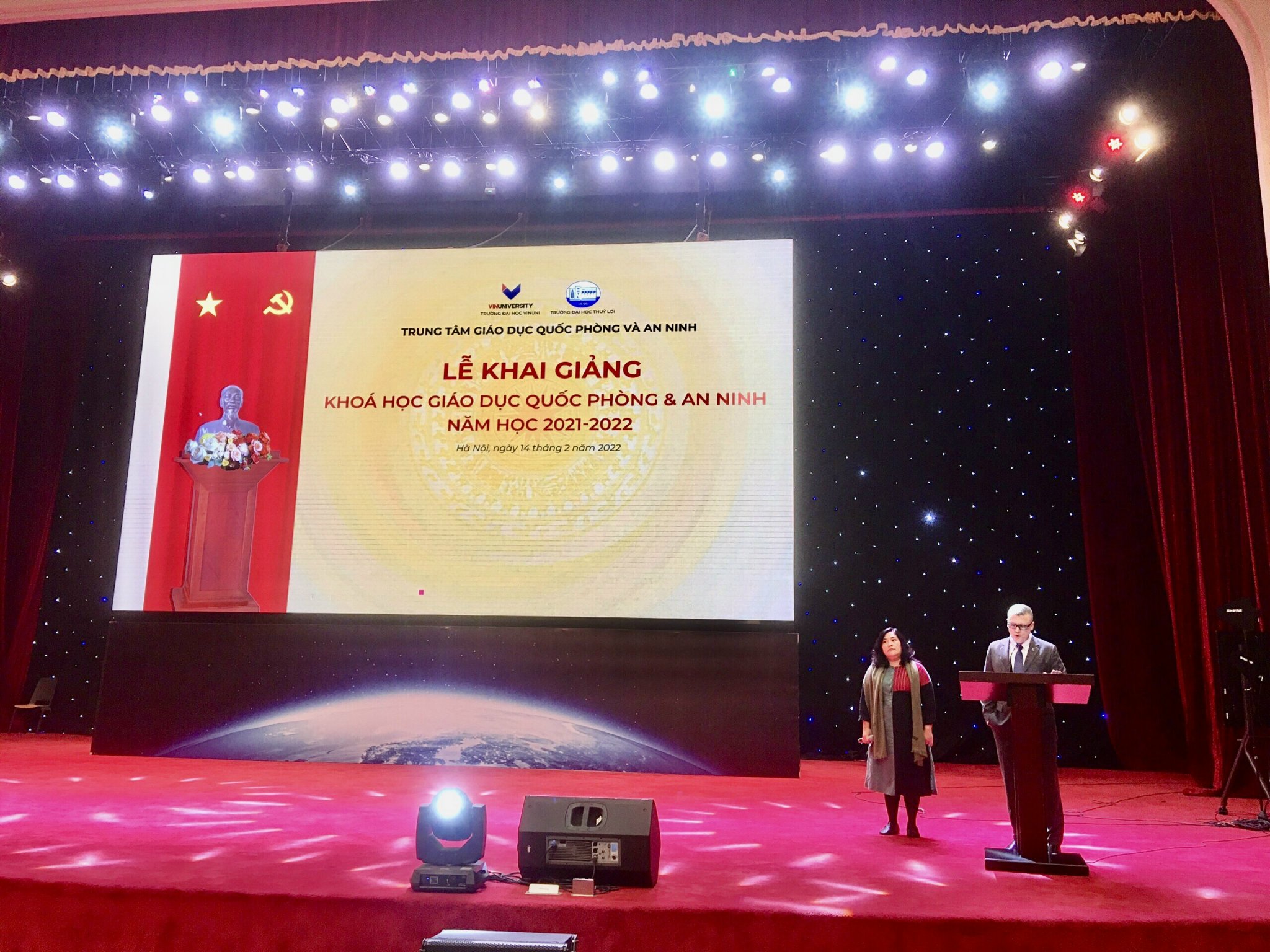 Phát biểu khai giảng, GS. David Harrison, Phó hiệu trưởng Trường Đại học VinUni cũng khẳng định vai trò và ý nghĩa của việc giảng dạy môn học Giáo dục quốc phòng và an ninh trong trường học. Đồng thời bày tỏ vui mừng khi được phối hợp với Trường Đại học Thủy lợi tổ chức khóa học Giáo dục quốc phòng & an ninh năm học 2021-2022 cho hơn 400 sinh viên khóa 01 và 02 của trường Đại học VinUni.