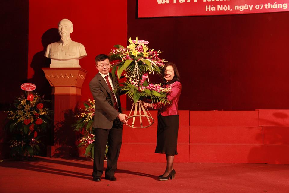 Thay mặt lãnh đạo nhà trường GS.TS Nguyễn Quang Kim tặng hoa các nữ cán bộ