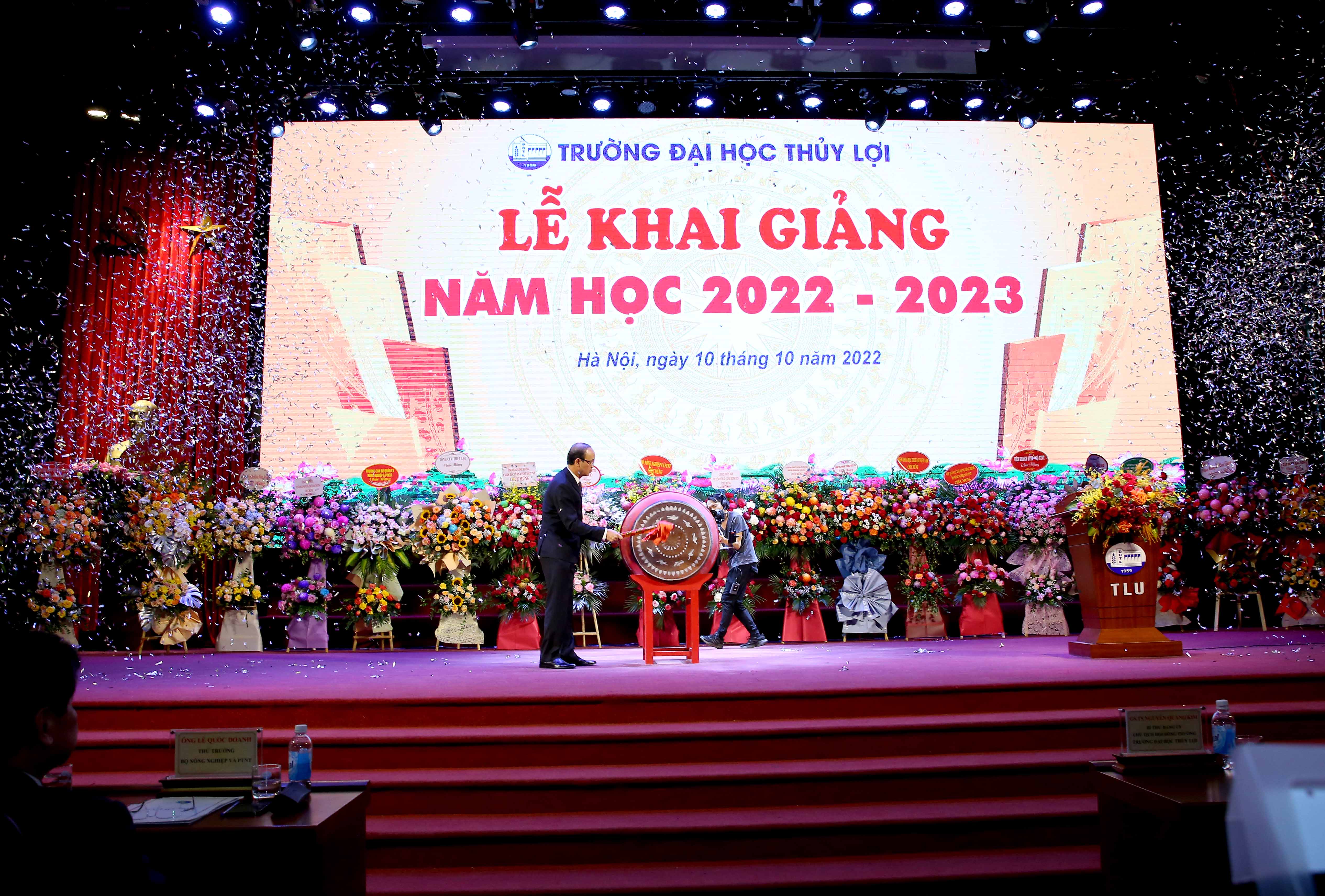 Thay mặt Đảng ủy, Ban giám hiệu và Hội đồng trường, GS.TS Trịnh Minh Thụ đã đánh hồi trống Khai trường, chính thức tuyên bố Khai giảng năm học mới 2022-2023