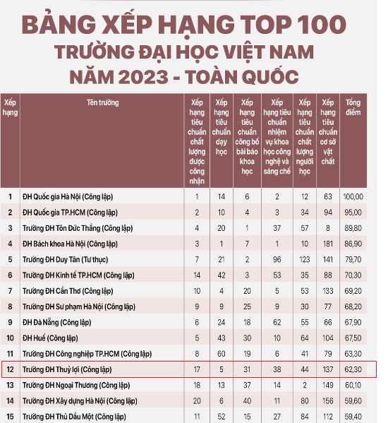 Theo đó, Trường Đại học Thủy lợi xếp thứ 12/ 100 trường đại học trên toàn quốc năm 2023 với tổng điểm đánh giá là 62.30 bao gồm các tiêu chí về xếp hạng tiêu chuẩn chất lượng được công nhận; xếp hạng tiêu chuẩn dạy học; xếp hạng tiêu chuẩn công bố bài báo khoa học; xếp hạng tiêu chuẩn nhiệm vụ khoa học công nghệ và sáng chế; xếp hạng tiêu chuẩn chất lượng người học và xếp hạng tiêu chuẩn cơ sở vật chất.