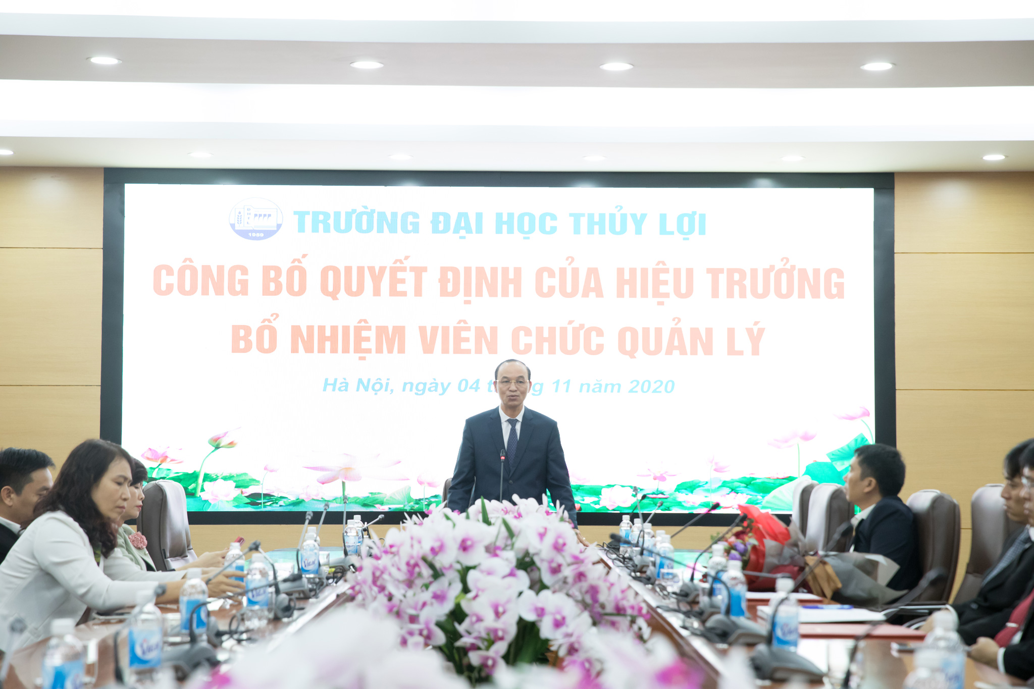 Tại buổi công bố quyết định, GS.TS Trịnh Minh Thụ, Hiệu trưởng Nhà trường chúc mừng hai cán bộ được bổ nhiệm lần này. Phòng Tổ chức cán bộ là đơn vị quan trọng trong Trường Đại học Thủy lợi với khối lượng công việc lớn, thường xuyên xử lý các công việc liên quan đến chế độ chính sách, bổ nhiệm cán bộ đối với viên chức trong Nhà trường. Việc có thêm nhân sự giúp cho công việc của phòng Tổ chức cán bộ được tốt hơn đáp ứng yêu cầu của Ban giám hiệu giao cho. Đối với Viện Kỹ thuật tài nguyên nước, nhiều năm qua đã có bước phát triển tốt, đáp ứng được yêu cầu về ứng dụng khoa học công nghệ vào thực tiễn. Trong thời gian tới, trong bối cảnh phát triển chung của đất nước cũng như công việc chung của Nhà trường, Viện Kỹ thuật tài nguyên nước cần phát triển hơn nữa với các dự án, đề tài phục vụ ngành nông nghiệp, nông thôn, quy hoạch Thủy lợi..vì vậy cần thiết có thêm những cán bộ có kinh nghiệm để giúp Viện Kỹ thuật tài nguyên nước phát triển.