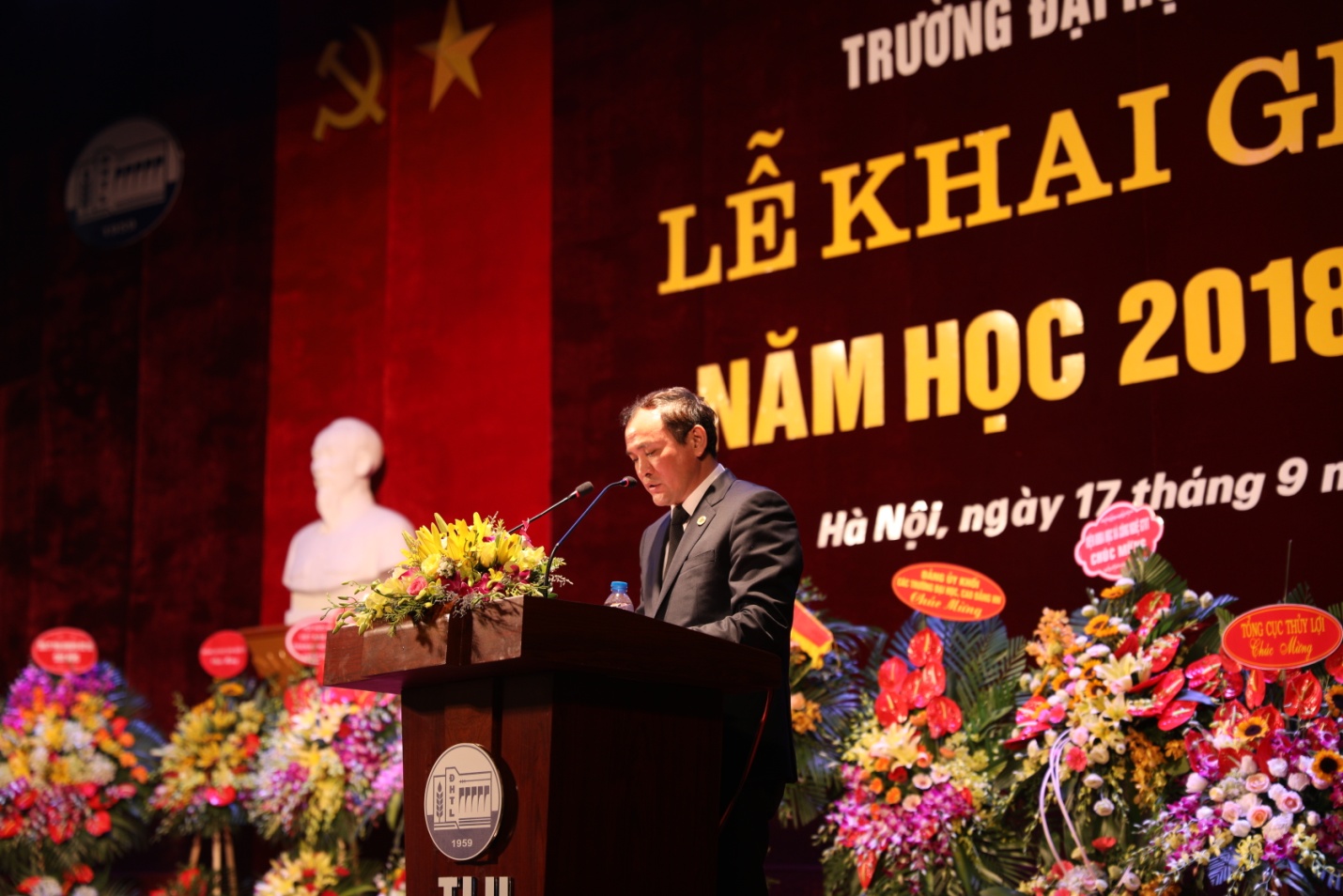 Chúc mừng thầy và trò Trường Đại học Thủy lợi, Thứ trưởng Bộ NN&PTNT Hoàng Văn Thắng ghi nhận những đóng góp to lớn của Nhà trường trong sự nghiệp xây dựng và phát triển đất nước. Năm học 2018-2019 này đứng trước bối cảnh nền kinh tế đất nước còn có những khó khăn, cạnh tranh trong hệ thống giáo dục cùng với quá trình tự chủ đại học, đòi hỏi Nhà trường cần có sự đổi mới sâu sắc cả về nhận thức và hành động. Thứ trưởng tin tưởng, với truyền thống tốt đẹp, sự nỗ lực không mệt mỏi, sự cống hiến tận tụy của thầy và trò, Trường Đại học Thủy lợi khẳng định sẽ hoàn thành xuất sắc nhiệm vụ năm học hướng tới kỷ niệm 60 năm ngày thành lập trường (1959 – 2019).