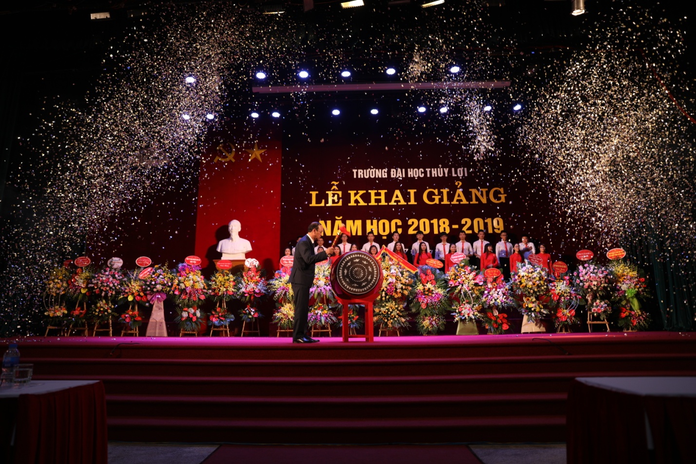 Thay mặt Đảng ủy, Ban giám hiệu và Hội đồng trường, GS.TS Trịnh Minh Thụ đã đánh hồi trống Khai trường, chính thức tuyên bố Khai giảng năm học mới 2018 – 2019.