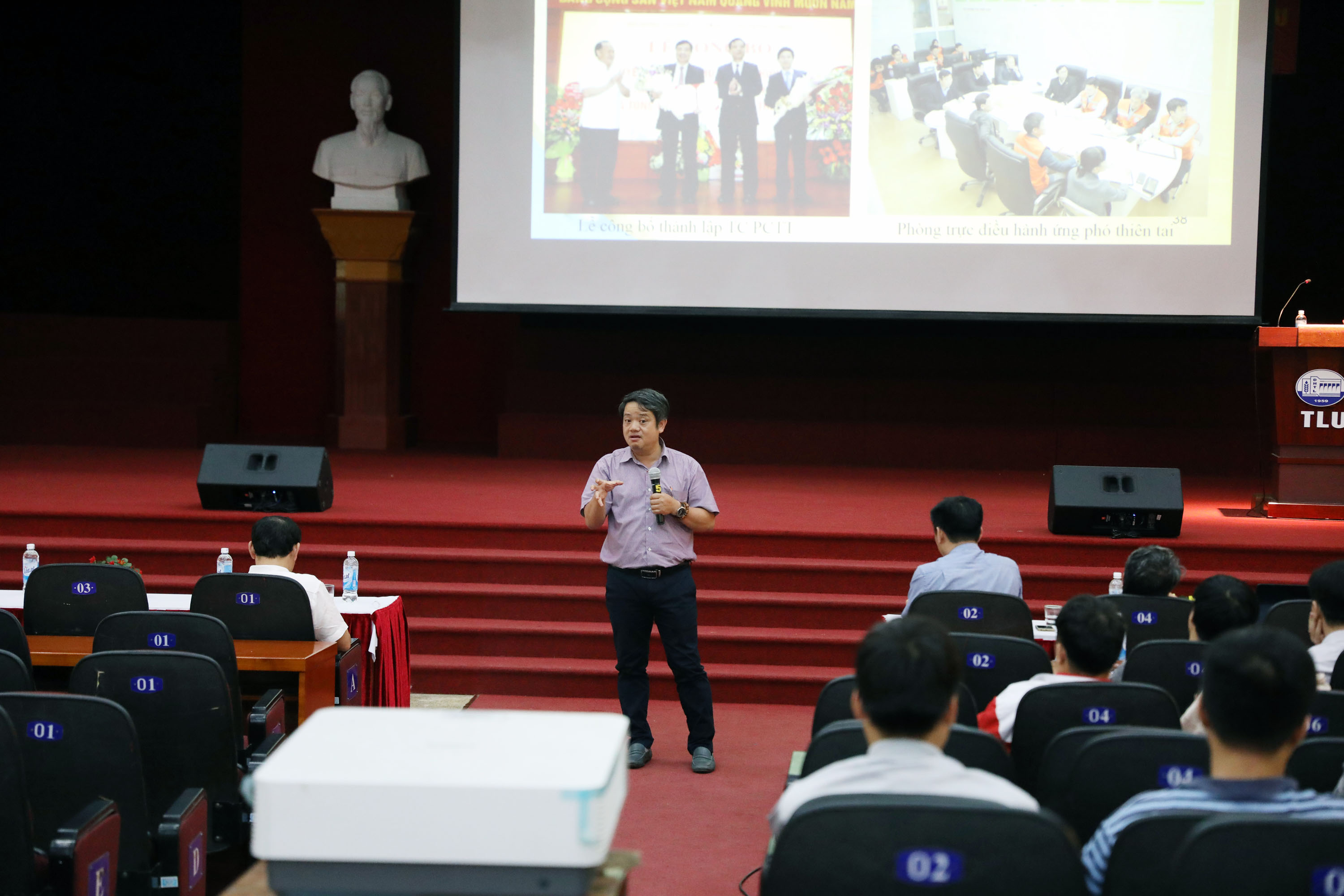 Cũng tại hội nghị, các cán bộ, giảng viên, sinh viên cũng được Ông Bùi Quang Huy – Phó giám đốc Trung tâm Chính sách và kỹ thuật phòng chống thiên tai – Tổng cục Phòng chống thiên tai giới thiệu những kiến thức cơ bản về ứng phó thiên tai, thích ứng với biến đổi khí hậu, bao gồm Phòng ngừa (Trước thiên tai), Ứng phó (Trong thiên tai) và Khắc phục hậu quả (Sau thiên tai). Đặc biệt trong bối cảnh Việt Nam là một trong những quốc gia chịu nhiều tác động nhất từ những biến đổi này.
