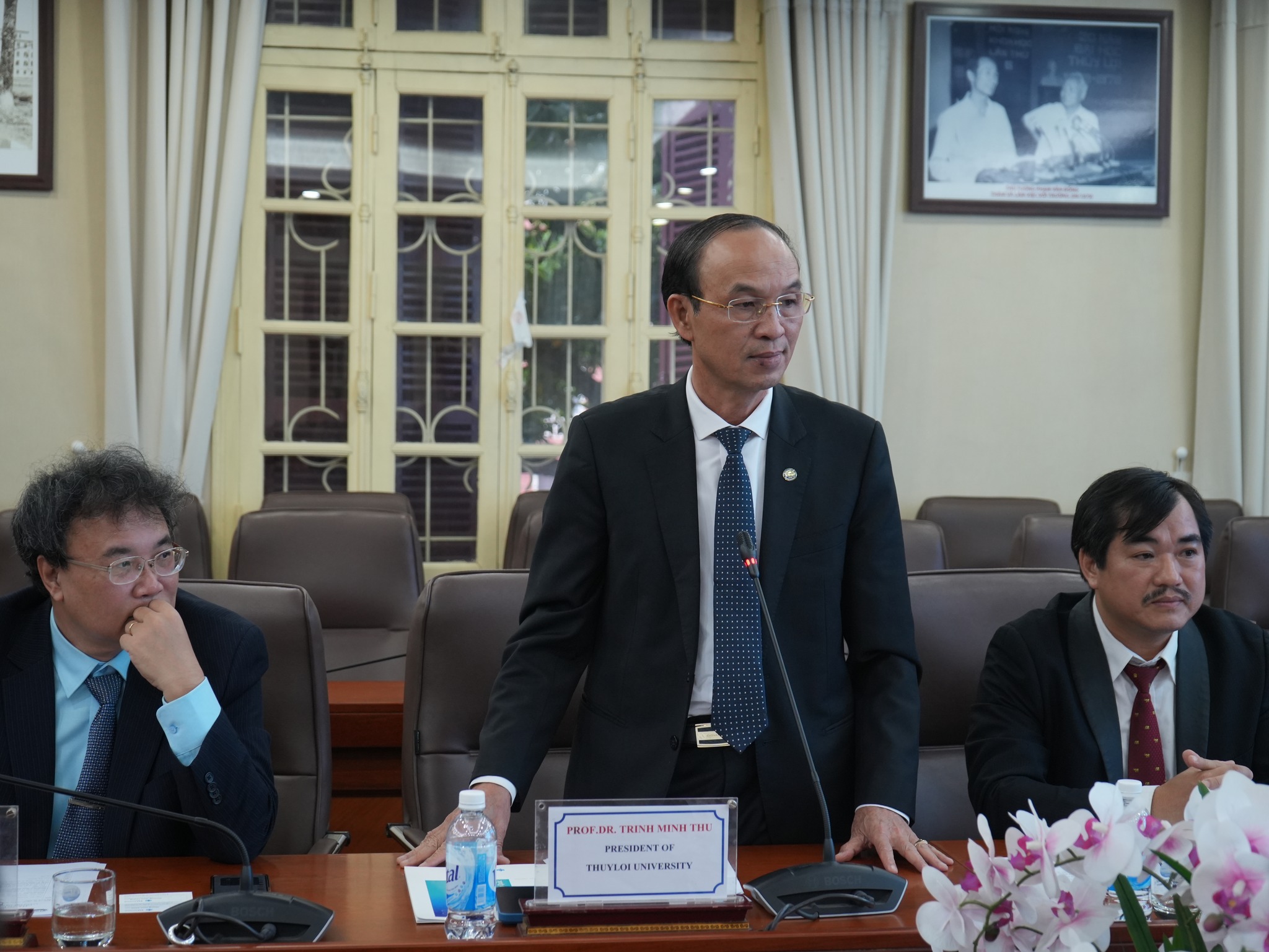 Phát biểu tại buổi lễ ký kết, GS.TS Trịnh Minh Thụ – Hiệu trưởng đã giới thiệu đôi nét về Nhà trường cũng như bày tỏ kỳ vọng về những kết quả của hợp tác trong tương lai. Theo Giáo sư, các nội dung trong ký kết hợp tác sẽ hỗ trợ nhà trường trong việc mở rộng mạng lưới hợp tác với các đối tác Hàn Quốc trong thời gian tới. Nhà trường cũng đang dự kiến mở ngành ngôn ngữ tiếng Hàn vì thế rất cần nhận được sự hỗ trợ nguồn nhân lực người Hàn Quốc để Trường ĐHTL phấn đấu là một trường đa ngành và cũng đóng góp vào sự phát triển chung của Trường ở các lĩnh vực đang là thế mạnh. Ngoài ra, GS Trịnh Minh Thụ cũng mong muốn triển khai chương trình trao đổi giảng viên, sinh viên, tài liệu ấn phẩm khoa học, cùng tổ chức hội thảo, seminar…với các trường đaị học hàng đầu của Hàn Quốc.