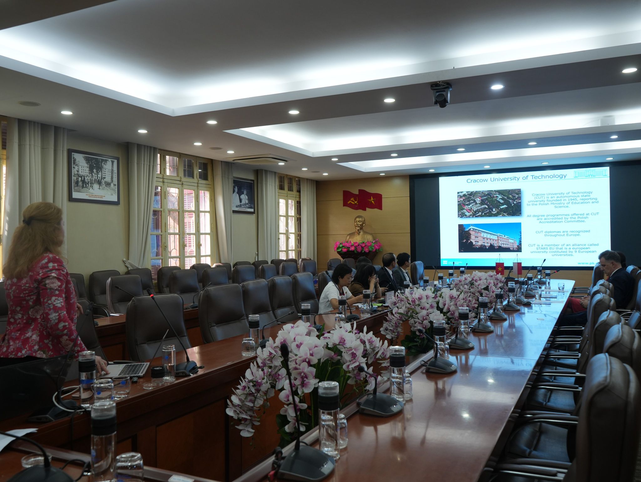 Sau bài phát biểu khai mạc và giới thiệu về trường ĐHTL của GS. Trịnh Minh Thụ – Hiệu Trưởng, GS. Stanislaw RYBICKI – Trưởng Khoa kỹ thuật môi trường và Năng lượng (CUT) thay mặt đoàn đại biểu bày tỏ lòng cảm ơn sâu sắc tới Ban lãnh đạo Nhà trường đã tiếp đón nồng hậu, chu đáo. GS. Stanislaw và Bà Katarzyna đã có bài chia sẻ giới thiệu về Đại học CUT với những thành tích nội bật trong các ngành kỹ thuật. Trường CUT đã ký hơn 290 hiệp định song phương với các trường đại học ở 53 quốc gia, được xếp hạng cao trong nhiều bảng xếp hạng quốc tế uy tín như Shanghai Ranking’s Global Ranking, QS World University Rankings …Trường có nhiều chính sách ưu đãi và thu hút sinh viên quốc tế từ nhiều nước trên thế giới đến học tập và trải nghiệm. Các chương trình được đào tạo bằng tiếng Anh, cung cấp chuyên môn sâu cũng như các khóa học 2-3 tuần về ngôn ngữ và văn hóa Ba Lan dành cho sinh viên quốc tế muốn tìm hiểu thêm về Ba Lan trước khi họ cam kết học hoặc nghiên cứu sau đại học tại châu Âu.