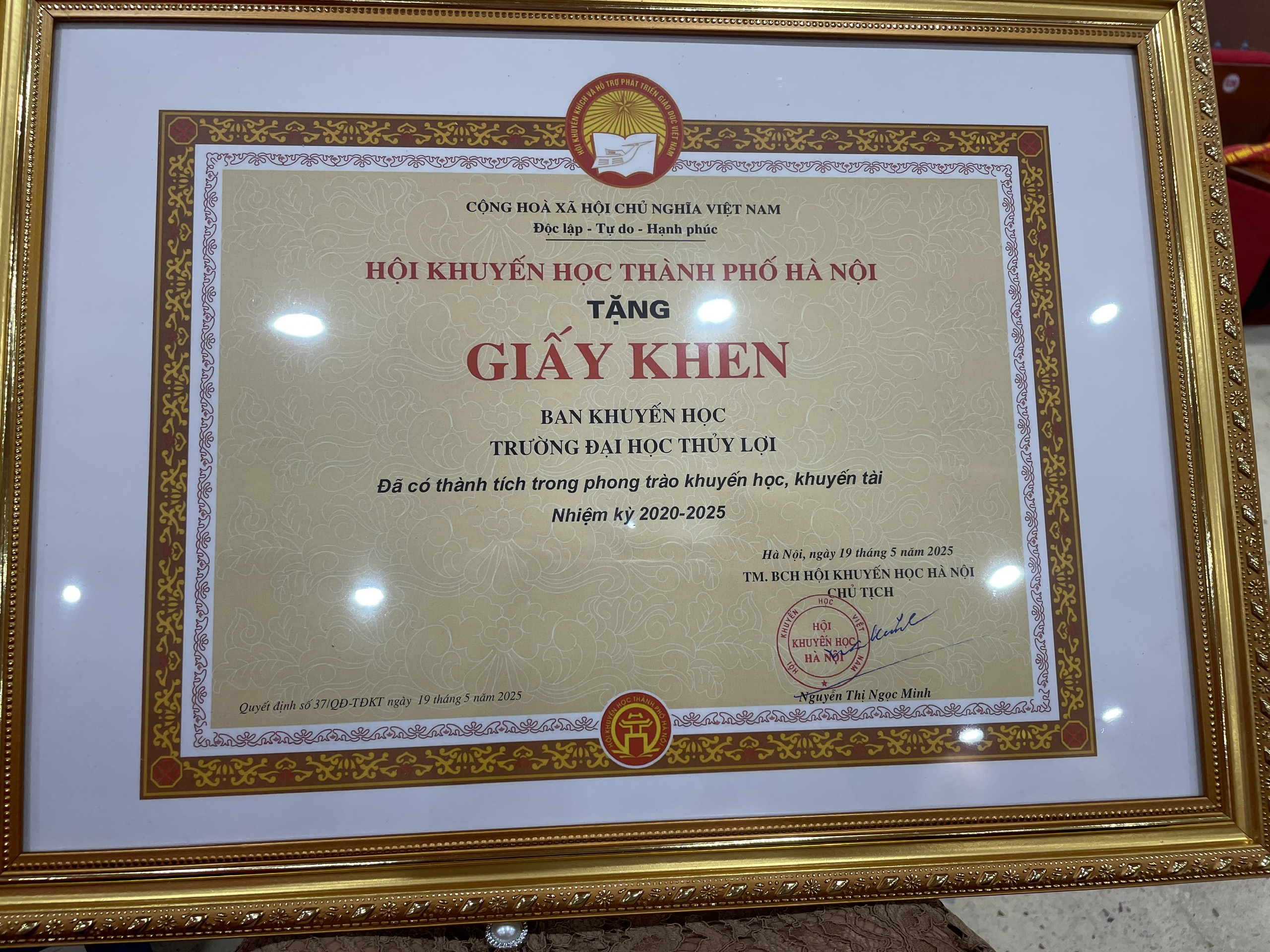 Đóng góp tích cực cho phong trao khuyến học chung của thành phố Hà Nội, Ban Khuyến học của Trường Đại học Thủy lợi được hội đánh giá cao về những thành tích đã đạt được trong phong trào khuyến học, khuyến tài nhiệm kỳ 2020-2025. Đây là sự ghi nhận xứng đáng cho những nỗ lực không ngừng của Nhà trường trong việc tạo điều kiện học tập, hỗ trợ sinh viên và cán bộ vượt khó vươn lên trong học tập và nghiên cứu. Trong thời gian qua, Ban Khuyến học đã triển khai nhiều chương trình ý nghĩa như trao học bổng cho sinh viên có hoàn cảnh khó khăn, cũng như đẩy mạnh phong trào học tập suốt đời trong toàn trường.