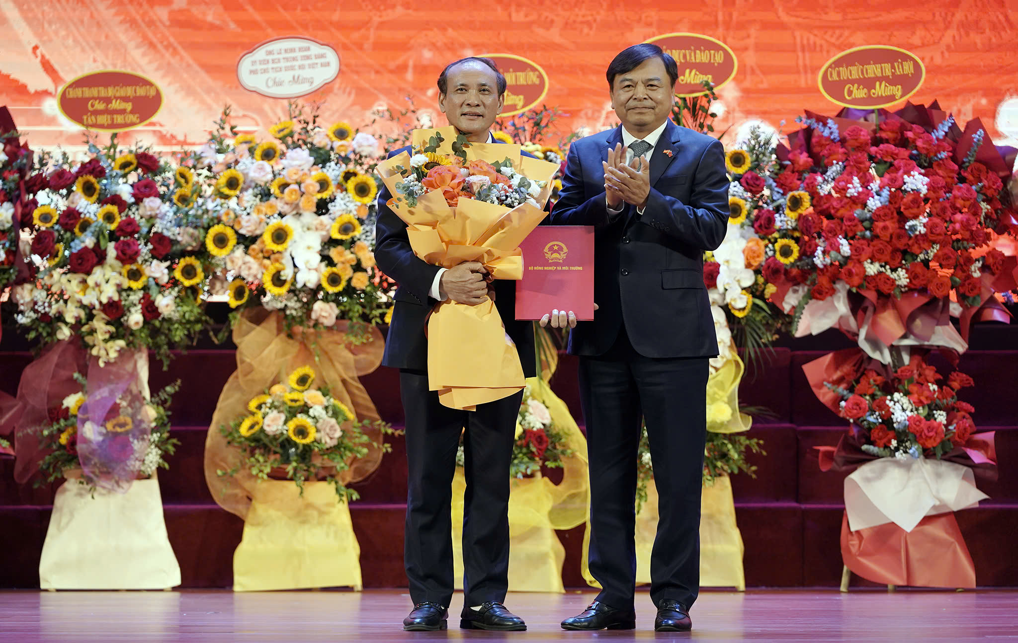Phó Chủ tịch Quốc hội Lê Minh Hoan chúc mừng tân Hiệu trưởng Nguyễn Trung Việt